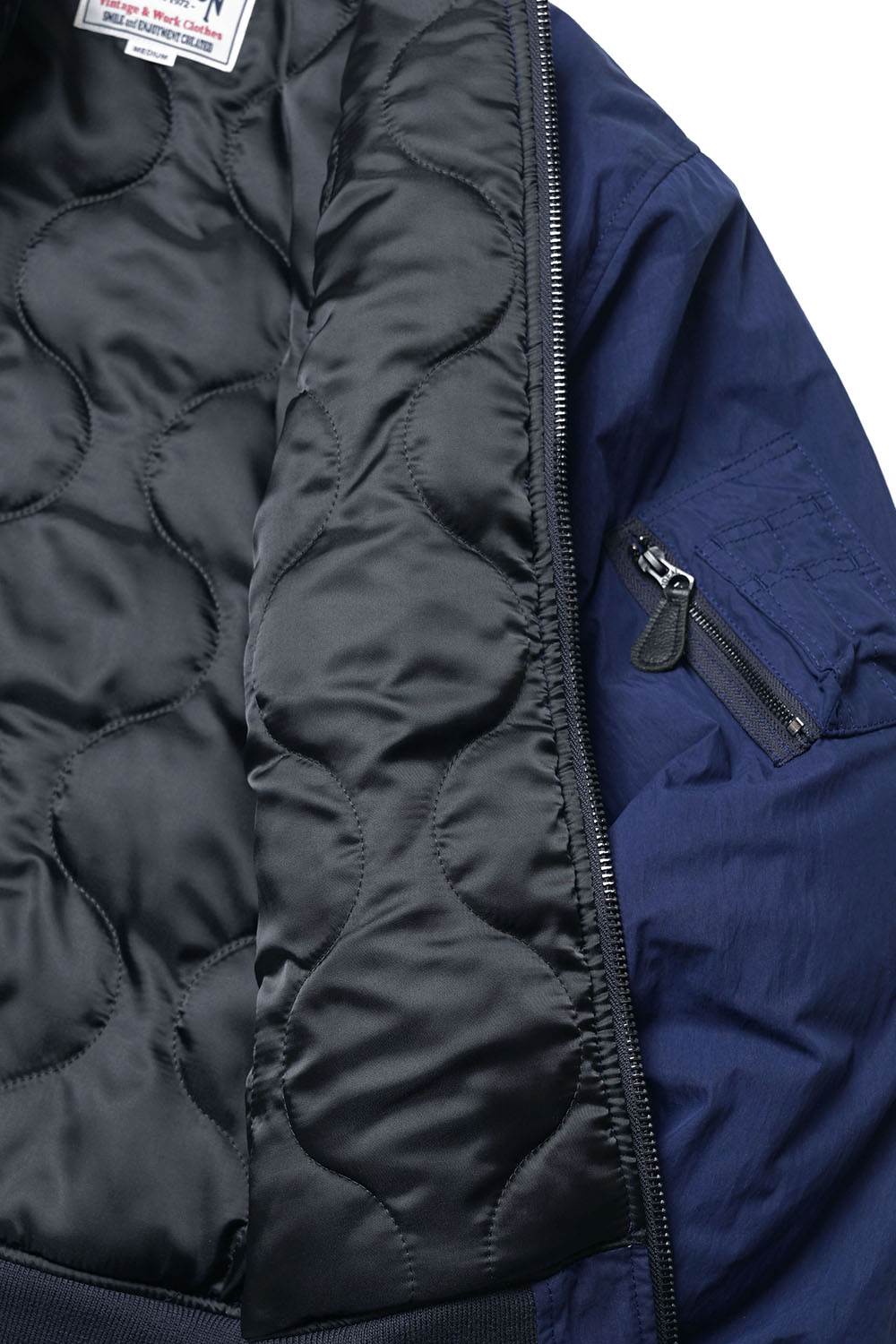 Houston Japan 51291 Velvetten Souvenir Jacket (188th) - Navy 광택을 억제한 코튼 나일론 혼합 원단으로 제작한 MA-1 입니다. 여유있는 실루엣이 특징인 아이템입니다. 안감이 퀼팅처리 되어 있어, 보온 효과에도 우수합니다. 착용시 L 사이즈가 일반적인 103 사이즈, XL 사이즈가 108 사이즈 정도입니다.