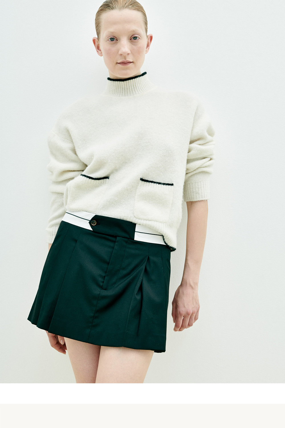 더가먼츠의 우먼 플루토 미니 스커트는 신축성 있는 폴리에스터와 비스코스 혼방 원단을 사용해 제작된 것이 특징입니다. - 허리 밴드에 포플린 트림 - 세 개의 포켓 스타일링 - 지퍼 플라이 - 앞쪽 트윈 플리츠 - 전체 비스코스 새틴 안감 *모델 신체 스펙 - 180cm / 착용 사이즈 - 8