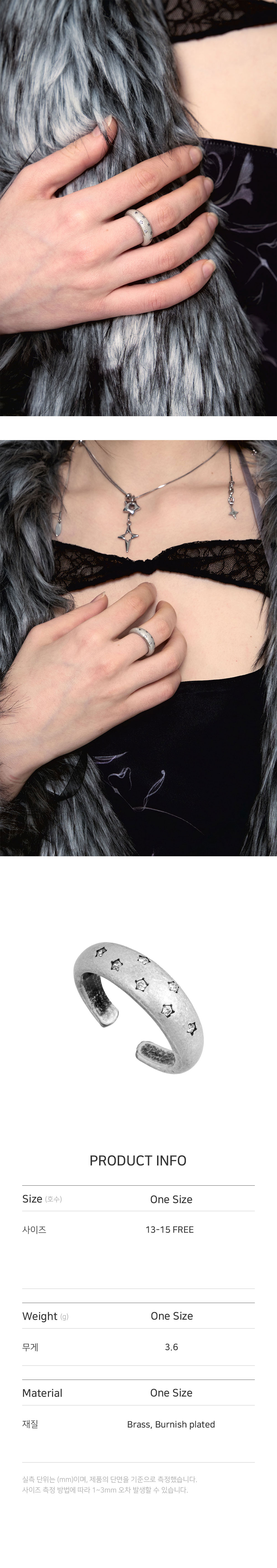 • 크기: 13-15호 FREE / 가로(W) 2.1CM X 세로(H) 2.1CM • 무게(WEIGHT): 3.6G • 심플 별 큐빅 링 • 제조국: 대한민국 • 부드러운 천으로 닦아 관리 • 소재: 신주(BRASS) 100% 버니쉬도금(BURNISH PLATED)