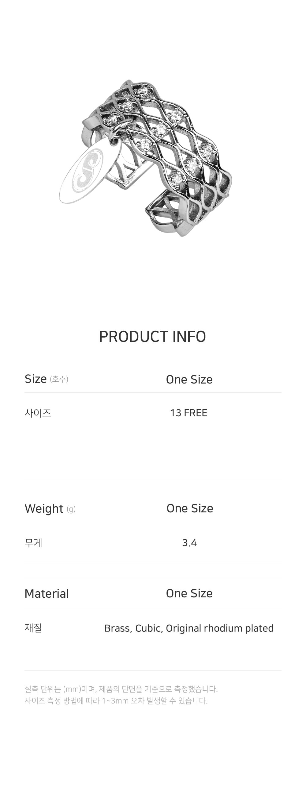 • 크기: 13호 FREE / 가로(W) 2CM X 세로(H) 2CM • 무게(WEIGHT): 3.4G • 13호 FREE • 제조국: 대한민국 • 부드러운 천으로 닦아 관리 • 소재: 신주(BRASS) 80% 큐빅(CUBIC) 20% OR두께도금(ORIGINAL RHODIUM PLATED)