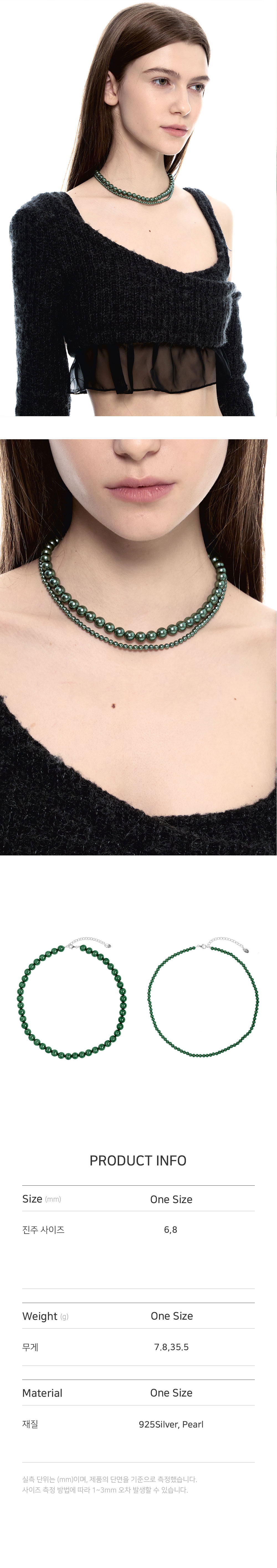 • 길이: 38CM+5CM • 무게(WEIGHT): 7.8G / 35.5G • 사이즈 4MM 8MM • 그린색상 핵진주 • 925실버 보조체인 • STM로고 925실버 장식 • 제조국: 대한민국 • 부드러운 천으로 닦아 관리 • 소재: 925SILVER 10% PEARL 90%