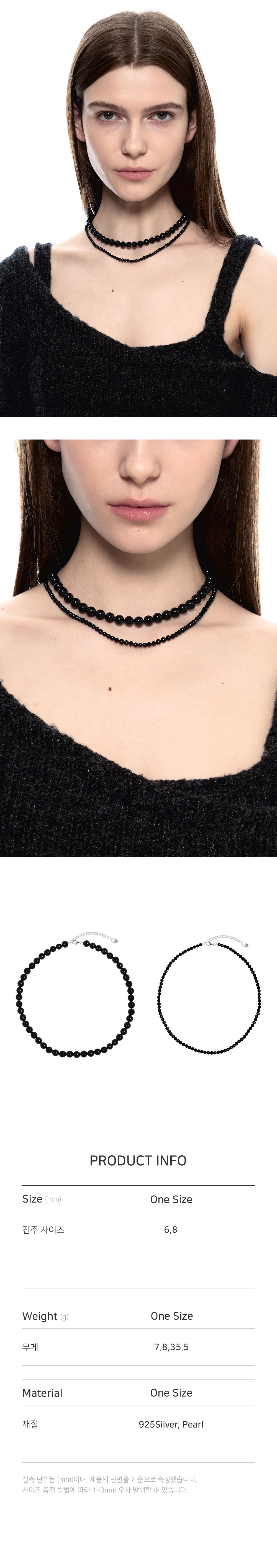 • 길이: 38CM+5CM • 무게(WEIGHT): 7.8G / 35.5G • 사이즈 4MM 8MM • 블랙색상 핵진주 • 925실버 보조체인 • STM로고 925실버 장식 • 제조국: 대한민국 • 부드러운 천으로 닦아 관리 • 소재: 925SILVER 10% PEARL 90%