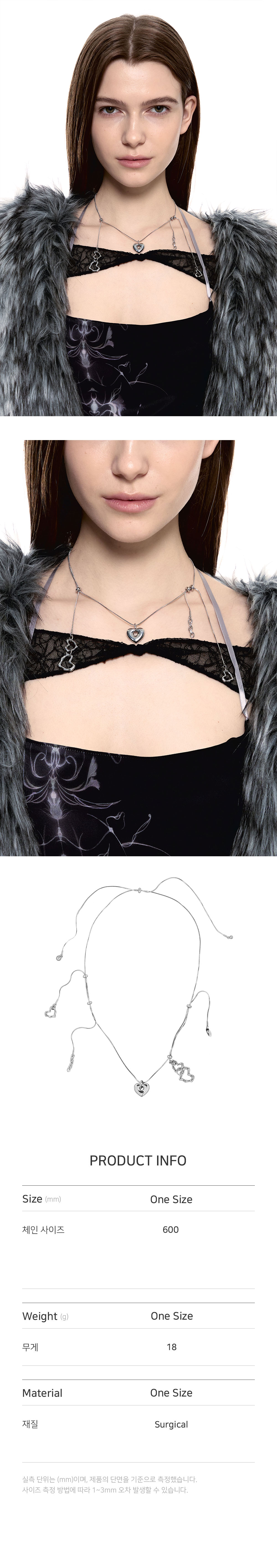 • 길이: 최대 60CM • 무게(WEIGHT): 13G • 레이어드 라인 네크리스 • 각 체인마다 길이조절 가능 • 자유로운 스타일링 연출 • 제조국: 대한민국 • 부드러운 천으로 닦아 관리 • 소재: 써지컬(SURGICAL) 100%