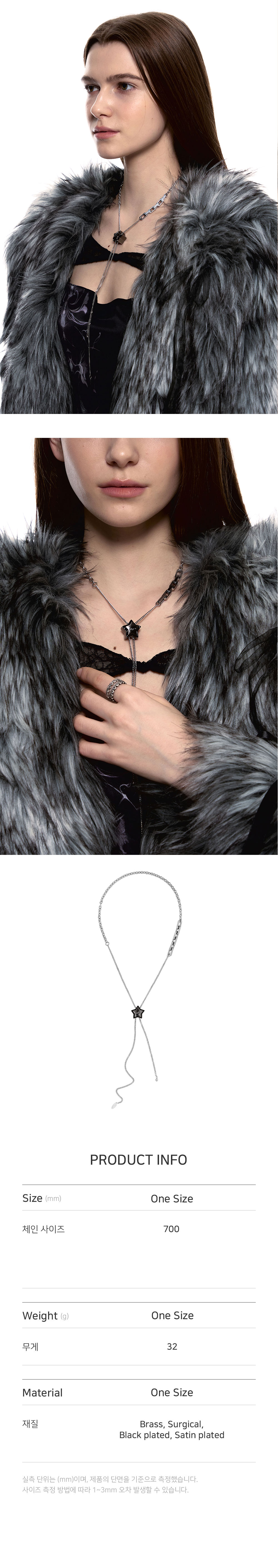 • 길이: 최대 70CM / 펜던트 크기: 가로(W)2CM X 세로(H)2CM • 무게(WEIGHT): 32G • 유니섹스 • 별 코드락 펜던트 • 코드락 슬라이드 장식 • 자유로운 길이조절 가능 • 제조국: 대한민국 • 부드러운 천으로 닦아 관리 • 소재: 신주(BRASS) 50% 써지컬(SURGICAL) 50% 블랙두께도금(BLACK PLATED) 사틴도금(SATIN PLATED)