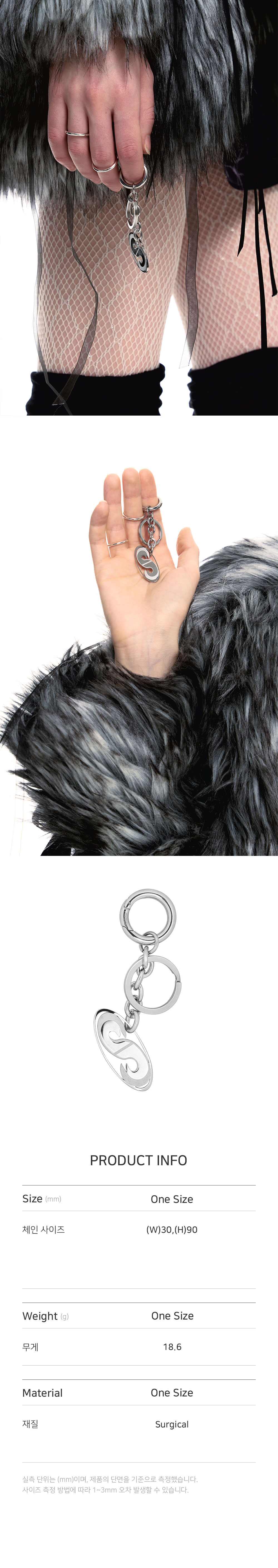 • 크기: 가로(W) 3CM X 세로(H) 9CM • 무게(WEIGHT): 18.6G • 메인 로고 심볼 펜던트 • 제조국: 대한민국 • 부드러운 천으로 닦아 관리 소재: 써지컬(SURGICAL) 100%