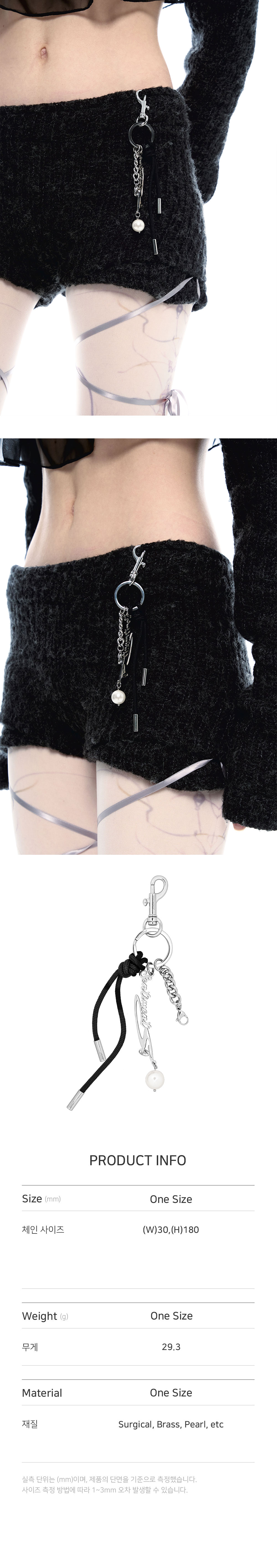 • 크기: 링 가로(W) 3CM X 세로(H) 18CM • 무게(WEIGHT): 29.3G • 이니셜 로고 타입 펜던트 • 제조국: 대한민국 • 부드러운 천으로 닦아 관리 소재: 써지컬(SURGICAL) 85% 황동(BRASS) 5% 진주(PEARL) 5% 기타(ETC) 5%