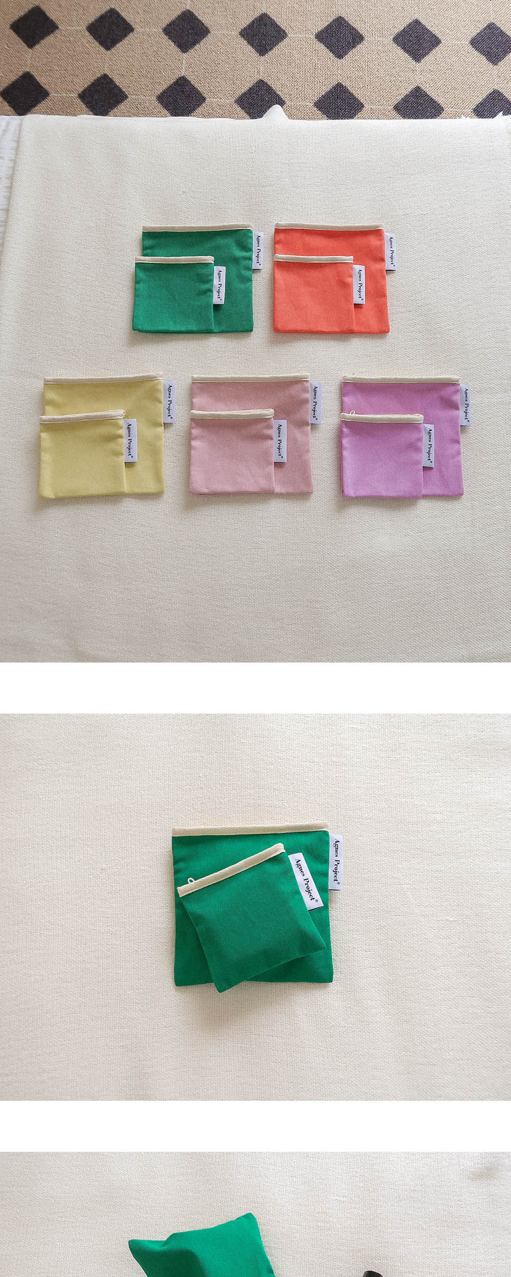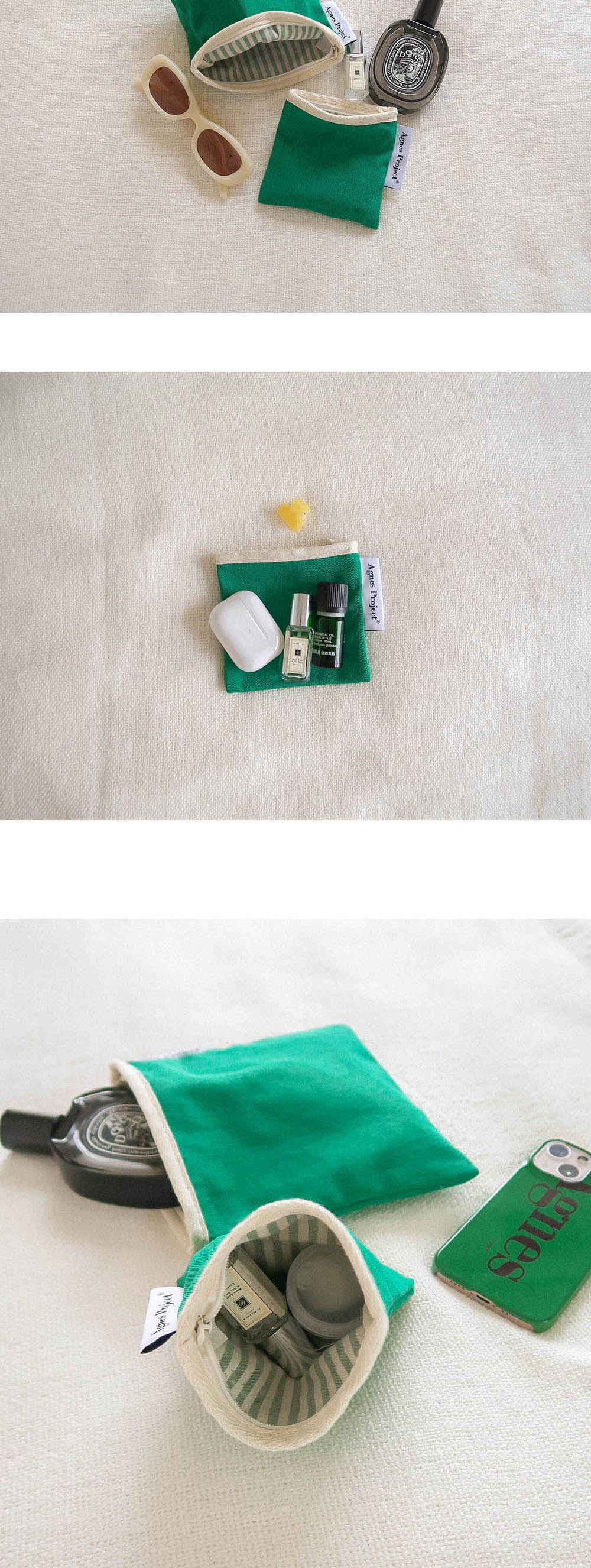 Square Color Pouch_Green (S) 안정감을 주는 정사각형 형태에 상단 지퍼 여닫이로 손쉬운 사용이 가능하고 수납하는 물건에 따라 자연스럽게 형태가 잡히는 파우치입니다. 겉면은 면 100% 탄탄한 트윌 원단에 워싱을 가공하였고, 안감은 린넨 스트라이프 원단을 사용하여 전체적으로 비비드하면서도 내추럴한 빈티지 무드를 담았습니다. 전체 마감은 면 100% 바이어스를 덧대어 튼튼하게 제작되었습니다. 사이즈는 두가지로, Small (W)11.5 X (H)11.5cm - 무선이어폰, 립밤, 동전, 카드 등 작은 소지품을 보관하기 좋습니다. Medium (W)17 X (H)17cm - 화장품, 여성용품 등 중간정도 크기의 소지품을 보관하기 좋습니다.