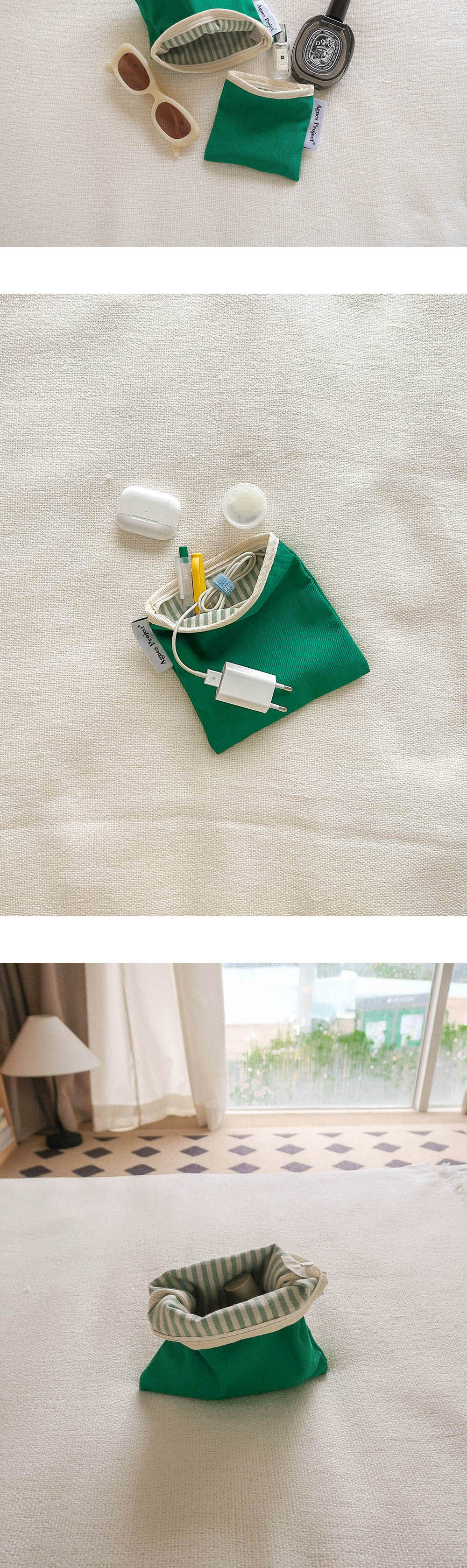 Square Color Pouch_Green (M) 안정감을 주는 정사각형 형태에 상단 지퍼 여닫이로 손쉬운 사용이 가능하고 수납하는 물건에 따라 자연스럽게 형태가 잡히는 파우치입니다. 겉면은 면 100% 탄탄한 트윌 원단에 워싱을 가공하였고, 안감은 린넨 스트라이프 원단을 사용하여 전체적으로 비비드하면서도 내추럴한 빈티지 무드를 담았습니다. 전체 마감은 면 100% 바이어스를 덧대어 튼튼하게 제작되었습니다. 사이즈는 두가지로, Small (W)11.5 X (H)11.5cm - 무선이어폰, 립밤, 동전, 카드 등 작은 소지품을 보관하기 좋습니다. Medium (W)17 X (H)17cm - 화장품, 여성용품 등 중간정도 크기의 소지품을 보관하기 좋습니다.