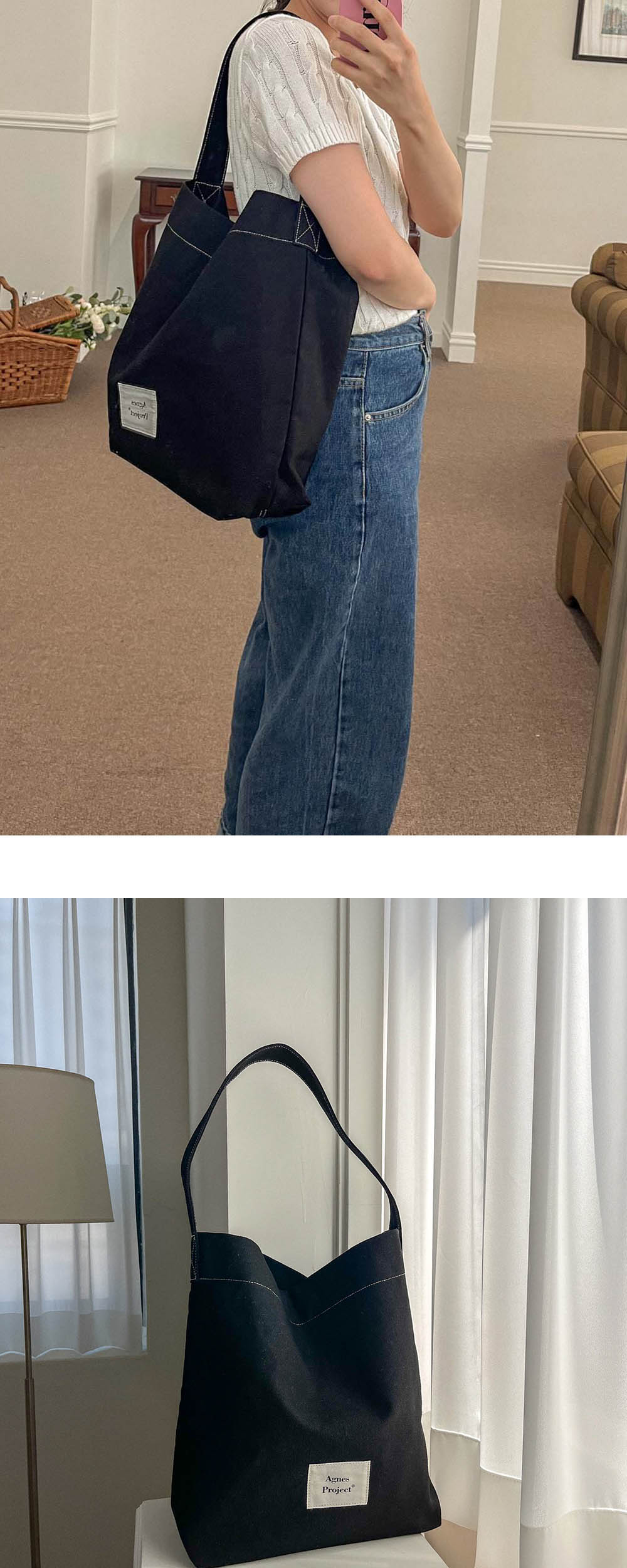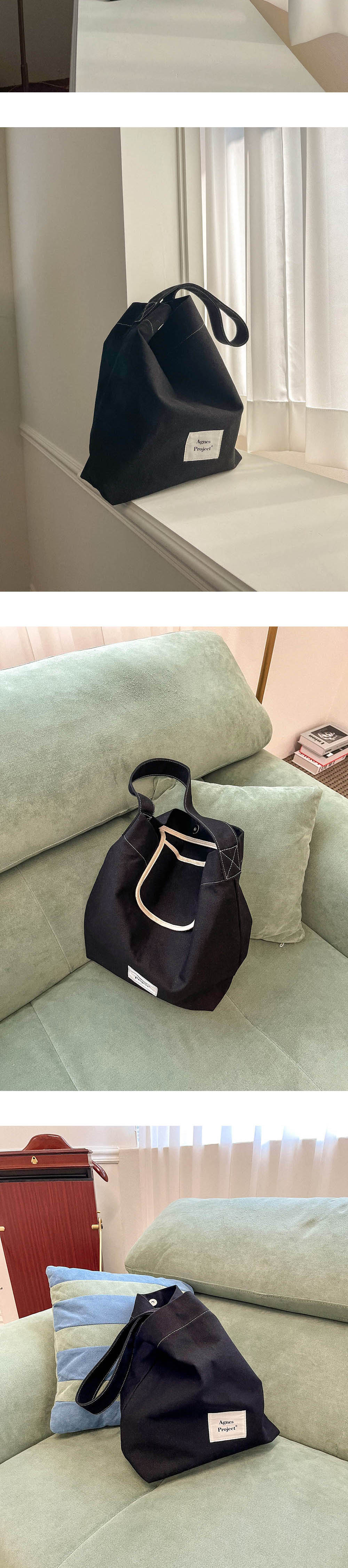 Peanut Shoulder Bag _ Black (피넛숄더백_블랙) 피넛 토트백보다 좀 더 큰 사이즈로 바디 쉐입이 자유로워 가방 크기에 비해 물건을 많이 담을 수 있어 활용도가 좋습니다. 컬러는 애플그린, 네이비, 베이지, 브릭, 내추럴, 블랙 6가지로 미니멀한 스타일에 자연스러운 포인트를 줄 수 있습니다. 사이즈는 맥북 13인치도 거뜬히 들어가며, 어깨에 매고 다니기 편한 숄더 스트랩이 있습니다. (사이즈 조절X) 내부에는 포켓이 있어 간단한 소지품을 보관하실 수 있고 자석 클로징으로 소지품이 빠질 염려를 줄였습니다. 면 100% 탄탄한 캔버스 소재로 제작된 시즌 리스 아이템으로 사계절 내내 함께하고 싶은 아그네스프로젝트의 피넛 숄더백입니다.