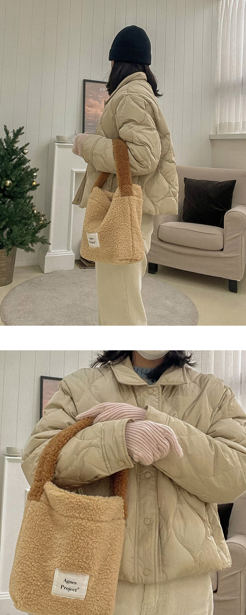 Peanut Tote Bag_TeddyBear 피넛토트백 뽀글이 버전(테디베어) 귀여운 곰돌이 같은 피넛 토트백 뽀글이 버전입니다. [Fabric] 소재는 두껍고 폭신폭신한 프리미엄 양면 후리스 원단을 사용하여 피부에 닿는 겉면은 포근하고 부드러운 감촉을 느낄 수 있고, 안쪽 면은 보송하고 따뜻한 터치감으로 겨울에 사용하기 좋은 뽀글이 가방입니다. 양털 원단 특유의 늘어짐을 보완하기 위해 도톰하면서 가벼운 양면 원단을 사용하였고, 불필요한 공정은 빼서 많은 짐을 넣어도 가벼운 것이 특징입니다. [Inner] 안쪽에 내부 포켓이 있어 간단한 소지품을 보관할 수 있고, 자석 클로징으로 소지품이 빠질 염려를 줄였습니다. 전체 마감은 면 100% 바이어스를 덧대어 튼튼하게 제작하였습니다. [Size] (w)18x(h)25x(d)10.5cm 핸들높이 15cm 167g
