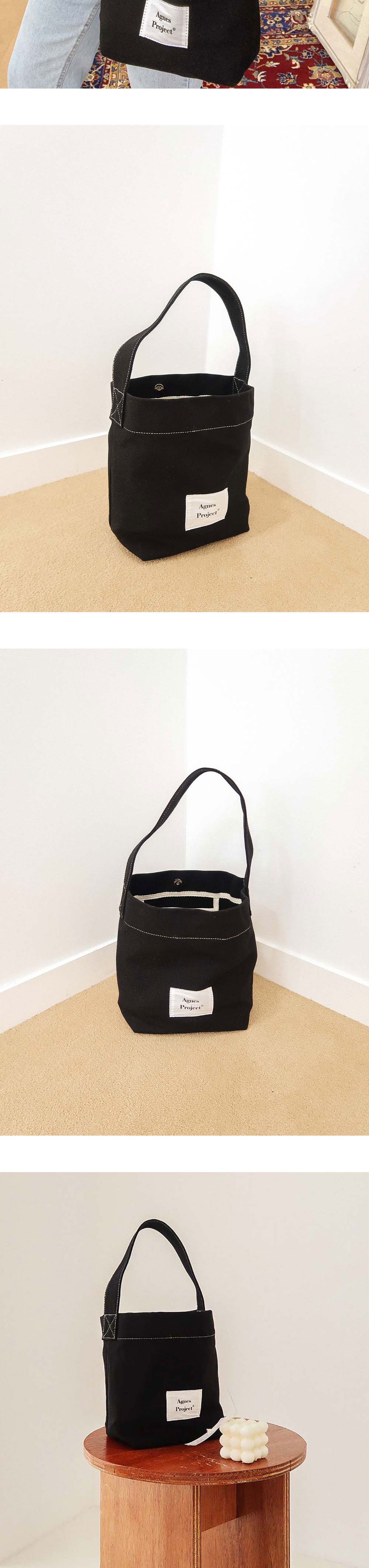 Peanut Tote Bag _ Black (피넛토트백_블랙) 너무 작지도 크지도 않은, 딱 중요한 소지품만 간편히 들고 다니고 싶을 때, 데일리 하면서 편히 들고 다닐 수 있는 가방이 필요했습니다. 제게 필요했던 가방이라 사심 담아 제작하였고, 미니멀한 스타일에 자연스러움을 담았습니다. 면 100% 탄탄한 캔버스 소재로 제작된 시즌 리스 아이템으로 사계절 내내 함께하고 싶은 아그네스의 세 번째 프로젝트, 피넛 토트백입니다.