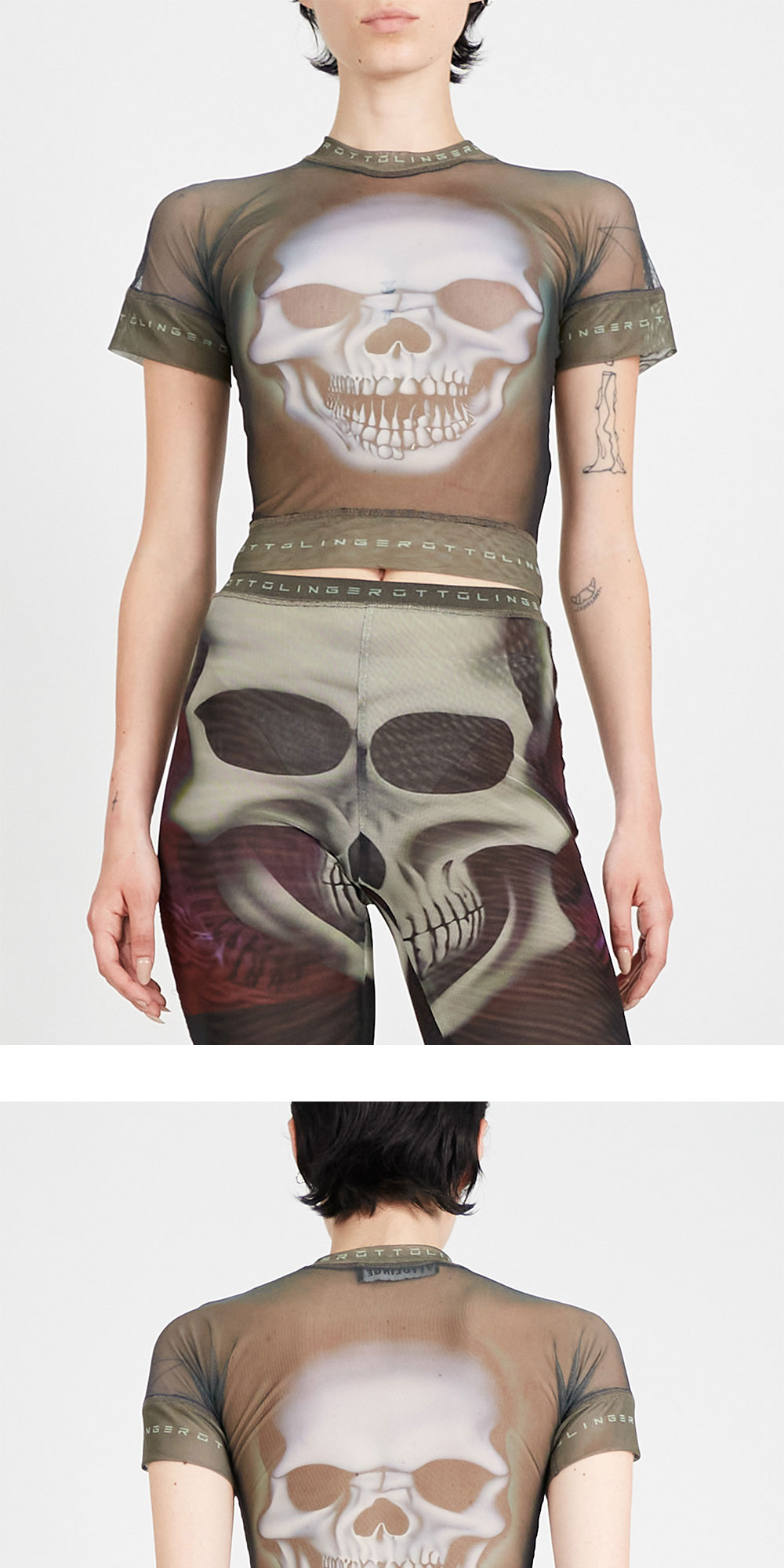 스컬 프린트가 매력적인 시스루 디자인의 오토링거 메쉬 티셔츠입니다. 재활용 또는 업사이클 소재를 최소 50% 이상 사용하여 제작한 것이 특징입니다. - 시스루 메쉬 디자인 - 신축성이 있는 디자인 - 전면 및 후면의 스컬 프린트 - 로고 트리밍 - 크루 넥 - 직선형의 밑단 - 재활용 또는 업사이클 소재를 최소 50% 이상 사용하여 제작
