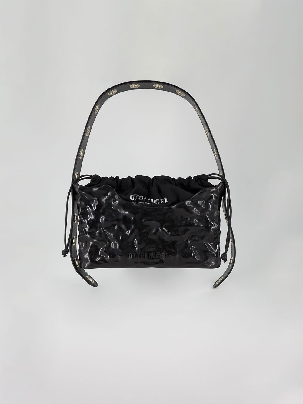 독특한 소재감과 쉐입이 독보적인 오토링거의 시그니쳐 바게트 백 블랙입니다. 스트랩까지 가득한 오토링거만의 디테일을 즐겨보세요. - 고광택 마감 - 조각된 디자인 - 메탈 아일렛 디테일 - 전면의 양각 로고 - 상단 드로스트링 여밈