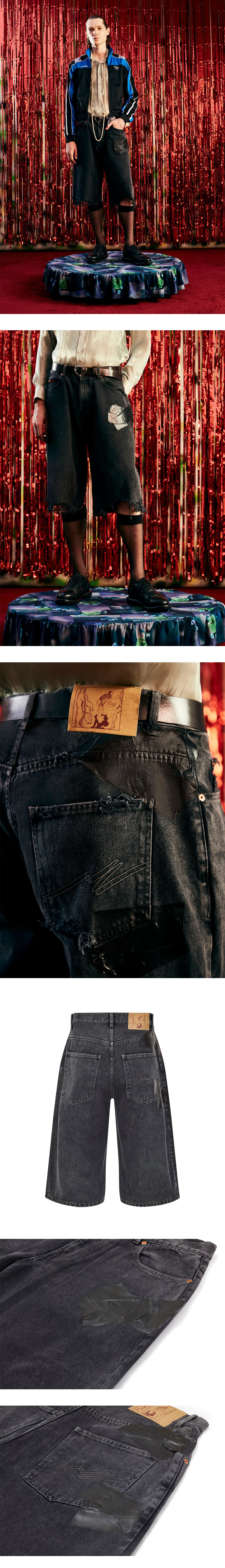 워시드 블랙 코튼 소재의 와이드 레그 진 쇼츠입니다. 전면과 후면의 가퍼 테이프 패치가 마틴 로즈 특유의 감성을 잘 보여주는 제품입니다. - 24SS 시즌 브랜드 로고 라벨 - 5개의 포켓 & 후면 포켓 스티치 - 레더 재크론 - 지퍼 플라이 및 실버 버튼 클로저 | 사이즈 가이드 | - 모델: 185cm - 착용 사이즈: S