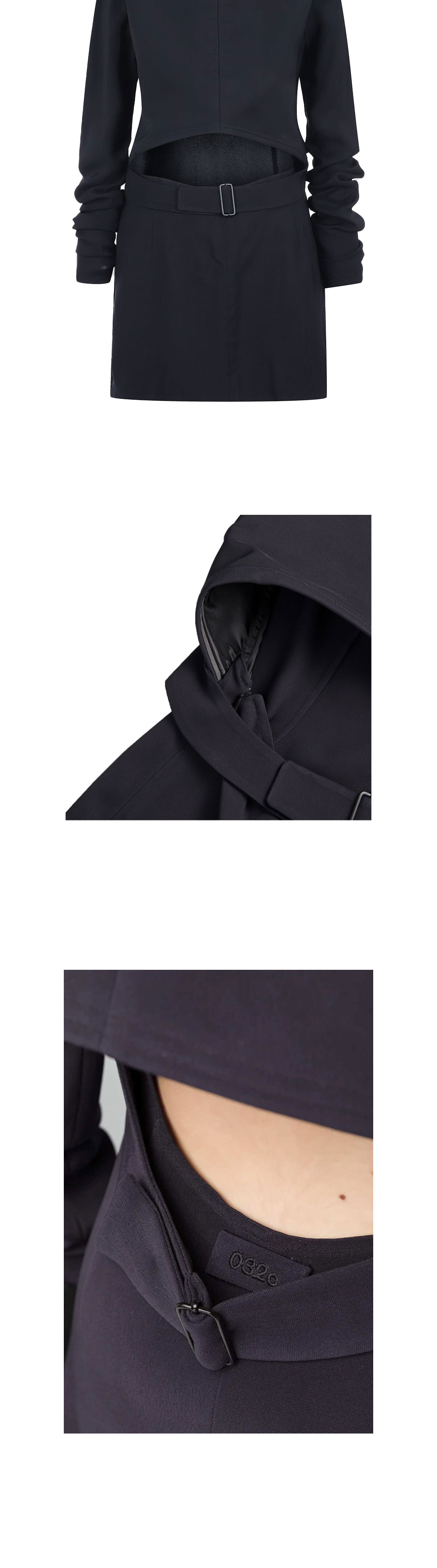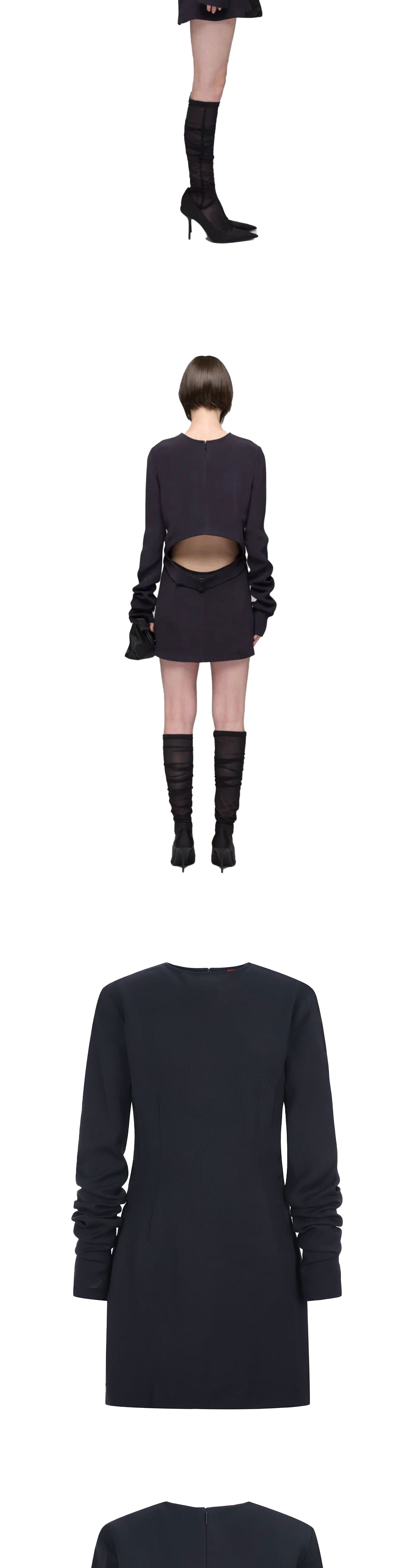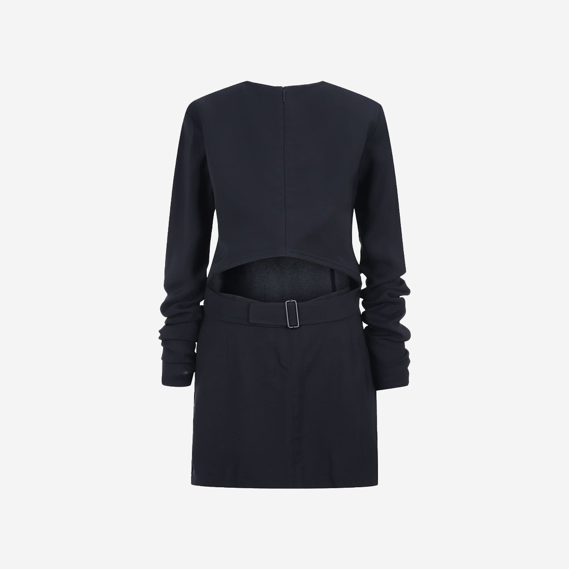 - 백 포인트 블랙 미니 드레스 - 컷아웃된 백 포인트 - 엑스트라 롱 슬리브 - 컷아웃 부분 아래 고정된 벨트와 띄워진 윗단