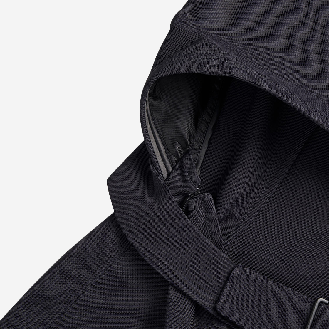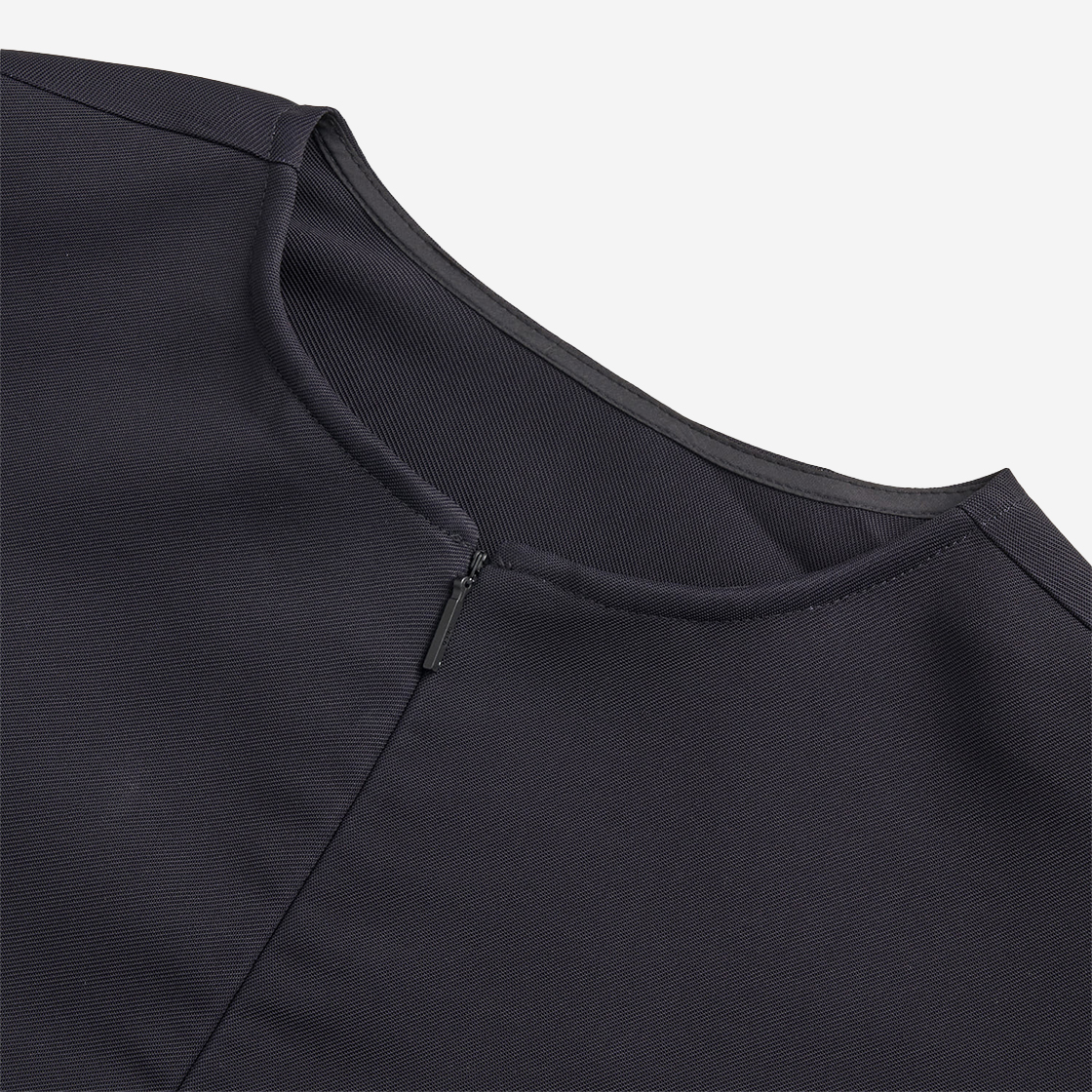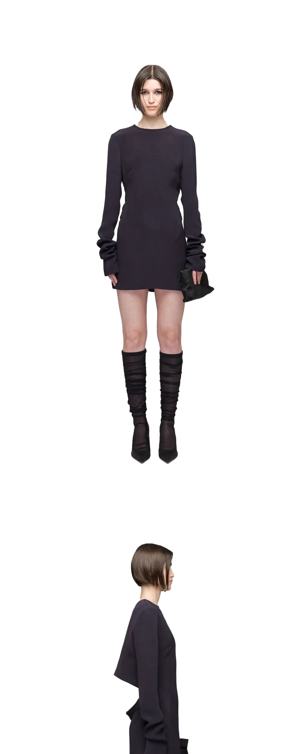 - 백 포인트 블랙 미니 드레스 - 컷아웃된 백 포인트 - 엑스트라 롱 슬리브 - 컷아웃 부분 아래 고정된 벨트와 띄워진 윗단