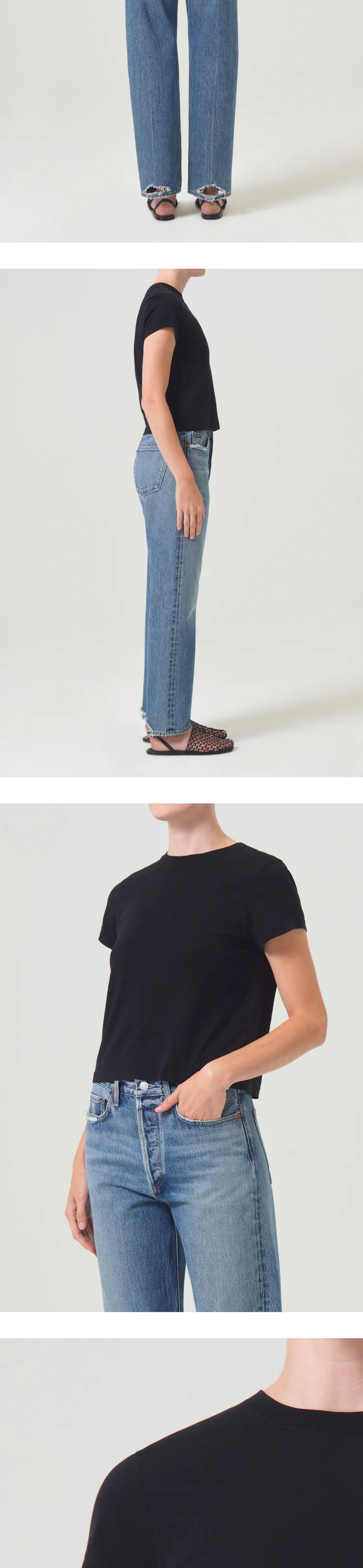 통기성이 좋고 굉장히 부드러운 오가닉 코튼(Organic Cotton)으로 만들어진 완벽한 크롭 티셔츠. 하이라이즈 팬츠나 청바지에 입는 것을 추천합니다. *모델 : 177cm, S 사이즈 착용