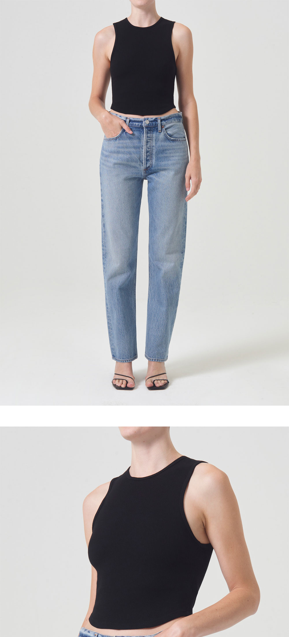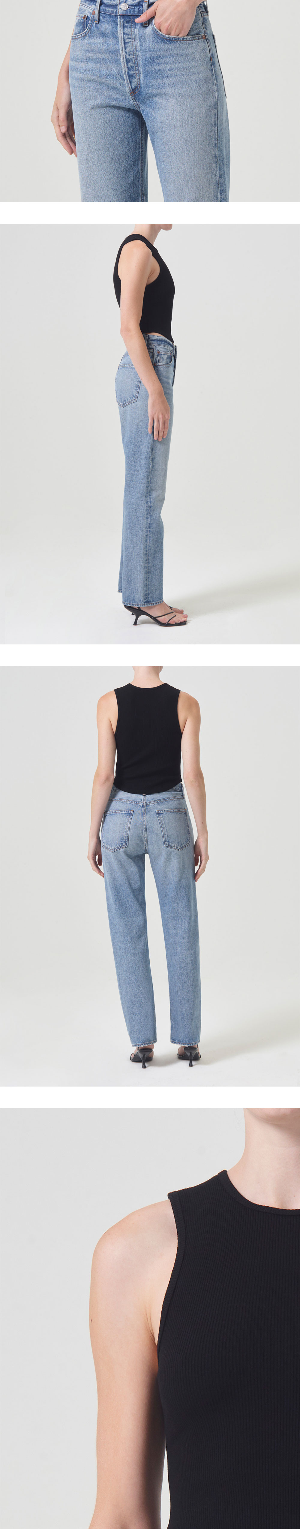 오가닉 코튼으로 만들어진 에이골디의 에센셜 탱크. 밑단이 곡선으로 잘려 로우라이즈 데님에 잘 어울립니다. *모델 : 177cm, S 사이즈 착용