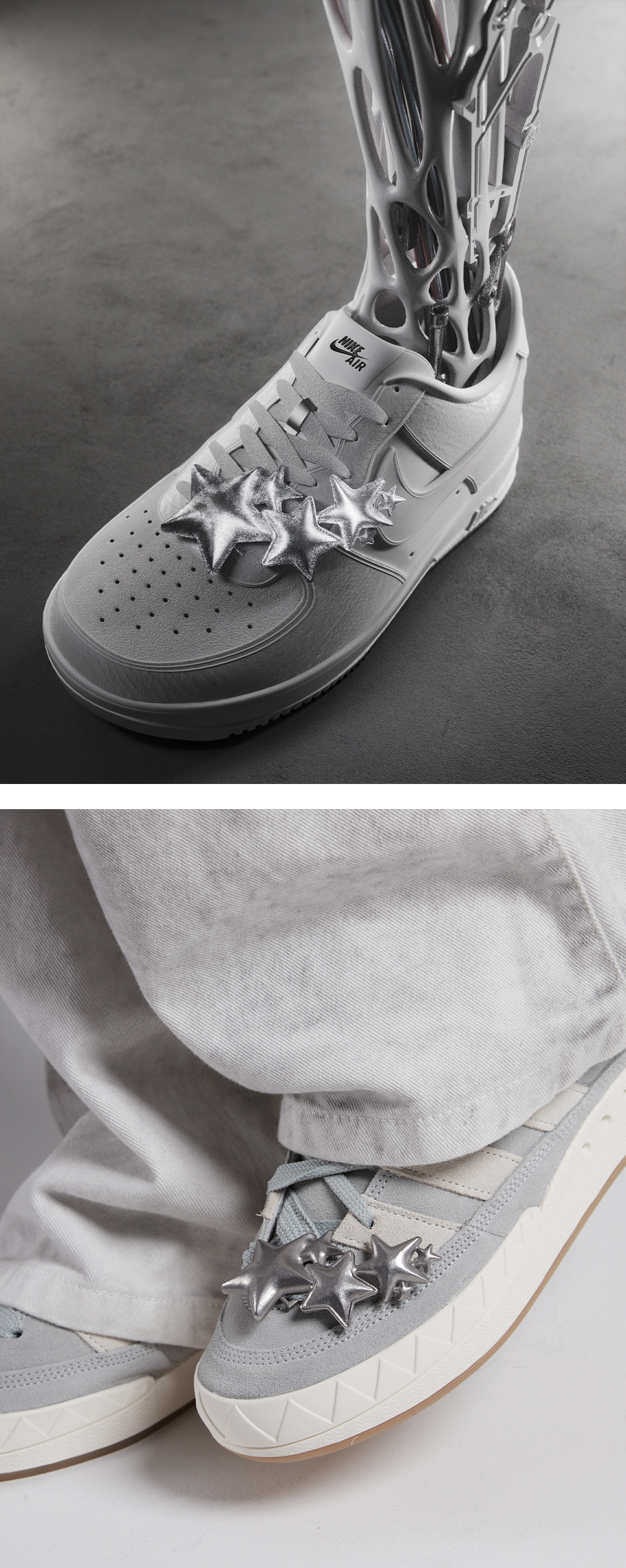 Season TASH Material - 316L Stainless Steel (Surgical Steel) Detail - 시그니처 박스 패키지 / Signature Box Package - Y2K 스타일의 스타 쉐입 / Star Shapes in Y2K Style - 텍스쳐감 있는 메탈릭 재질 / Metallic Material with texture * 신발 미포함 제품입니다. * 착용 대상 제품의 끈 종류 / 사이즈 확인 후 구매를 권장드립니다. (권장 사이즈: 225~) * 디자인 특성상 모서리 부분이 날카로우니 착용/보관 시 주의가 필요하며, 무리하게 착용 시 주위 제품에 손상이 갈 수 있습니다.
