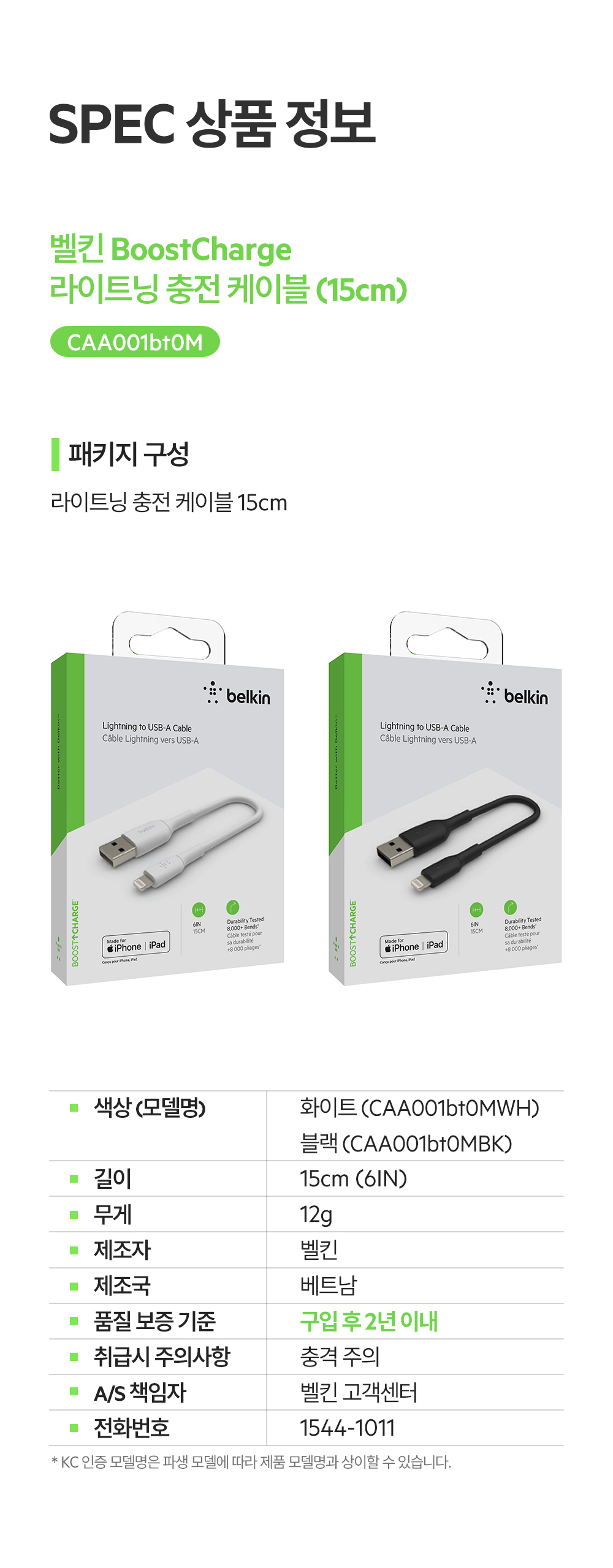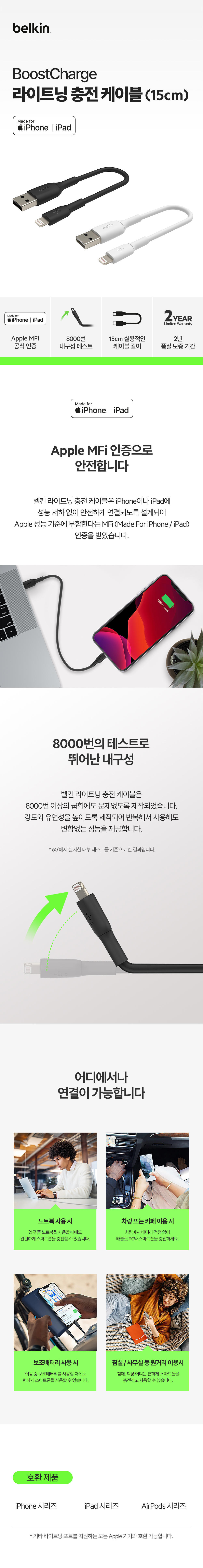 벨킨 부스트업 라이트닝 아이폰 충전 케이블 15CM CAA001bt0M 블랙