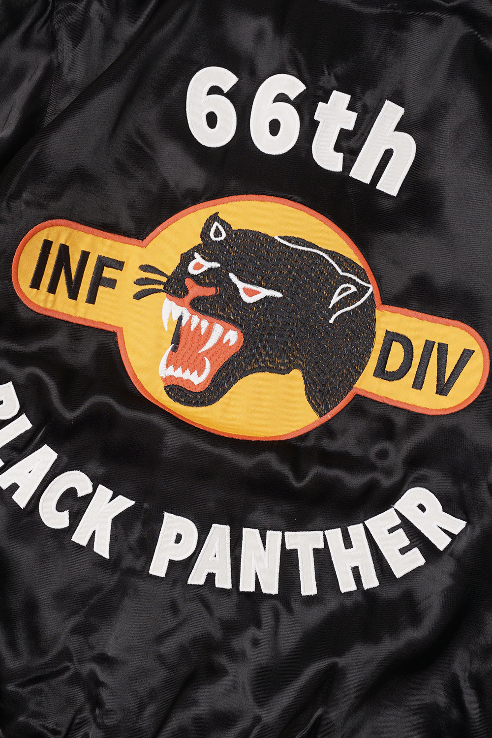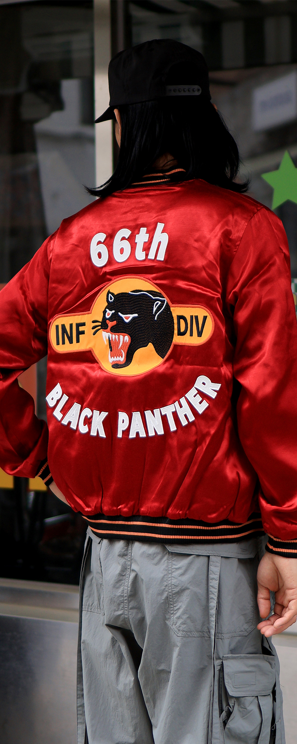 Houston Japan 51249 Black Panther Rayon Award Jacket - Black 60년대 레이온 원단을 사용한 어워드 자켓입니다. 넥라인은 리브사양이며, 프론트는 탈착에 용이한 스냅버튼 타입입니다. 가슴부분에는 체인자수와 블랙팬서 모티브의 와펜을 배치하였습니다. 소맷와 밑단은 목부분과 비슷한 디자인의 리브사양이며 양 사이드에는 포켓이 있습니다. 안감의 내부 좌측에는 안주머니를 장착하였습니다. 등부분에는 블랙팬서 와펜이 특징이며, 겉감은 광택이 흐르는 고급 레이온 원단을 사용하였습니다.