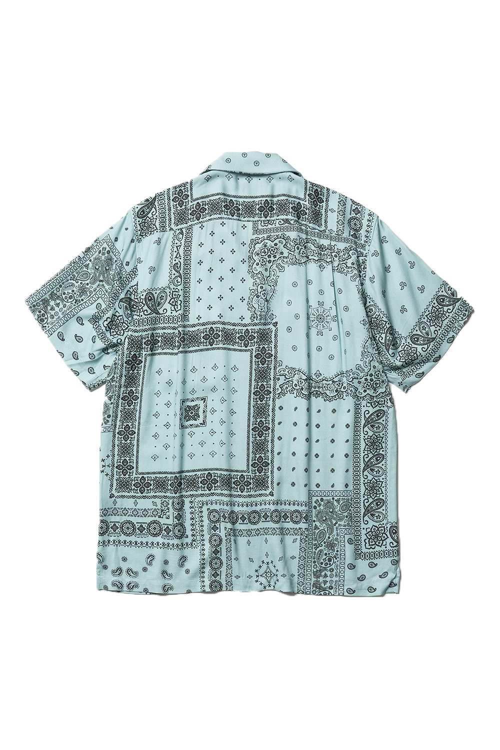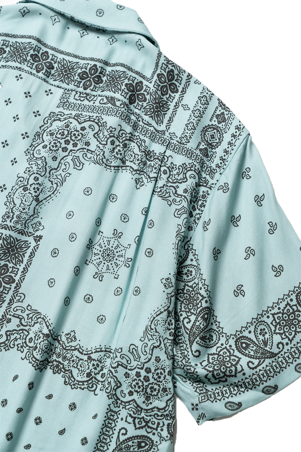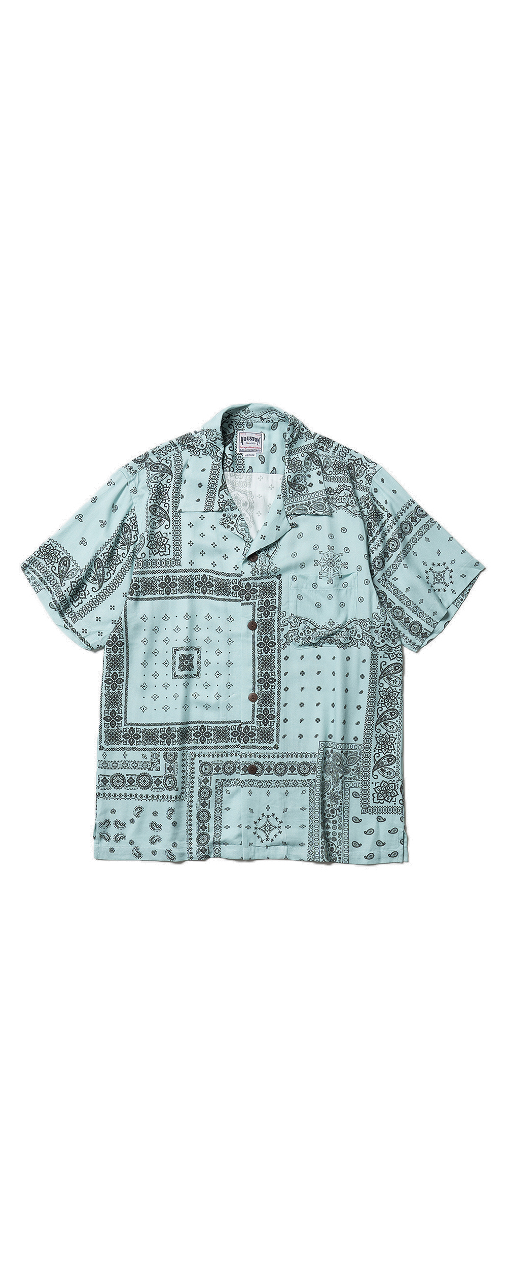 Houston Japan 41025 Aloha Shirt (Bandana) - Mint 반다나 프린팅의 트로피칼 셔츠입니다. 오픈칼라 타입으로 레이온 소재 특유의 부드러운 촉감이 특징입니다. 코코넛 무늬의 버튼을 채용하여 남국의 무드를 연출 하였으며 프론트 좌측 포켓에는 선글라스 등 간단한 소품들의 수납이 가능합니다.
