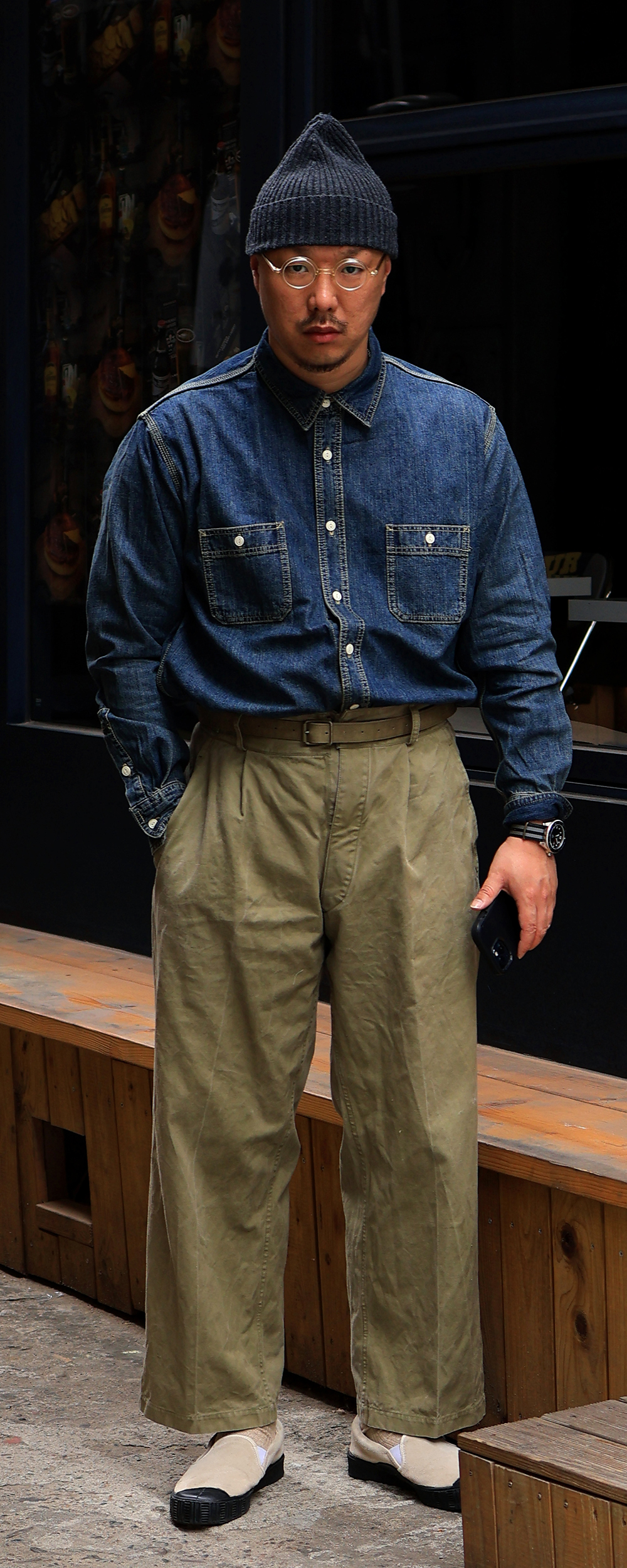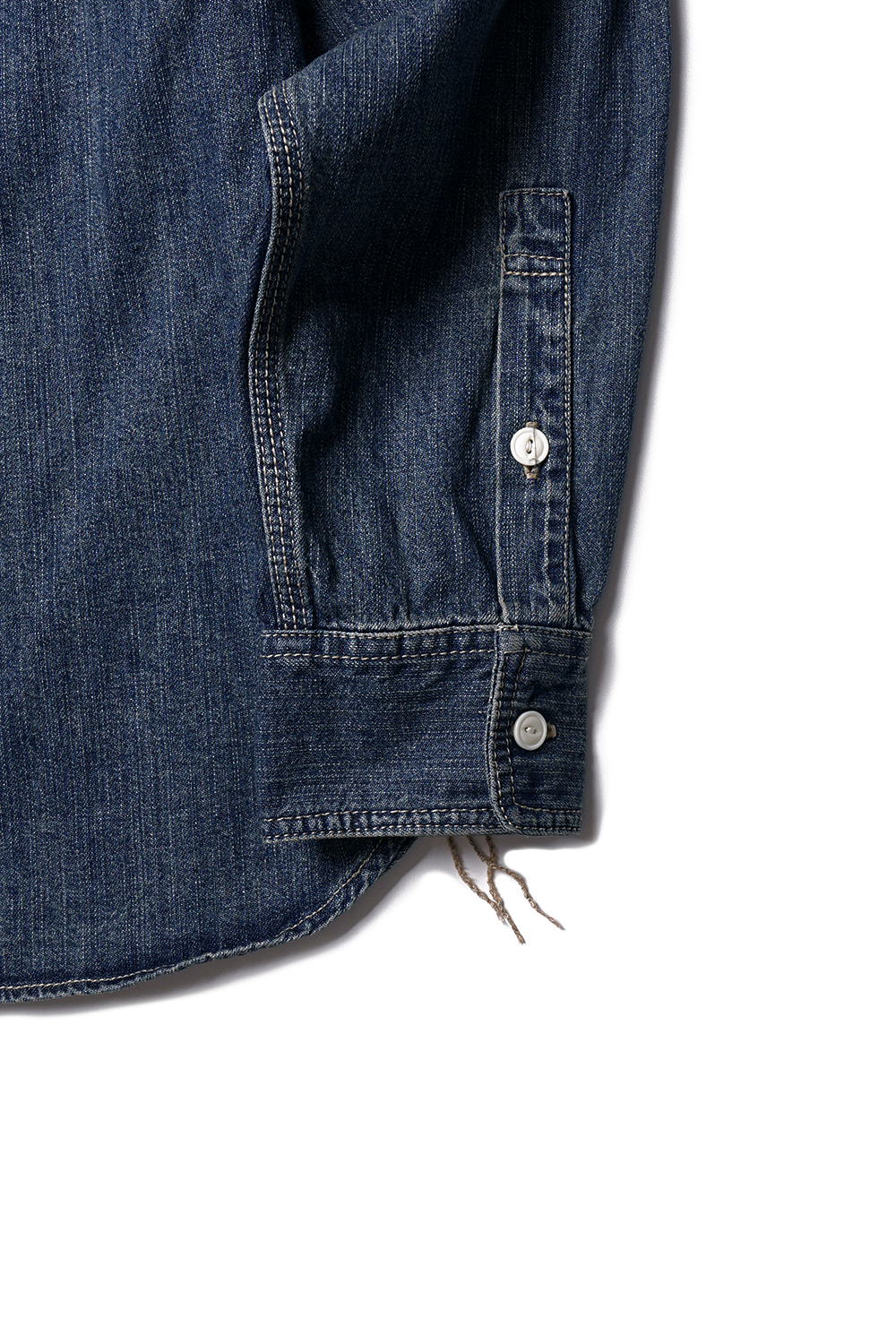 Houston Japan 40511 USA Cotton Denim Work Shirt - Indigo 미군산 코튼을 사용하여 제작한 데님 워크 셔츠입니다. 워싱가공을 거쳐, 자연스러운 색감과 부드러운 원단이 특징입니다. 레귤러 넥카라와 프론트 양측의 버튼 사양의 포켓을 장착하였으며, 봉제실의 마찰 등 손상에 강한 고양이눈 버튼을 사용하고 있습니다. 소매는 싱글 버튼과 건틀릿 버튼의 존재로 롤업에 용이하며, 옆면에는 트리풀 스티치로 봉제되어 있습니다. * Cotton 100% * 빛에 의한 제품의 색감 차이가 존재 할 수 있습니다. * Made in Vietnam