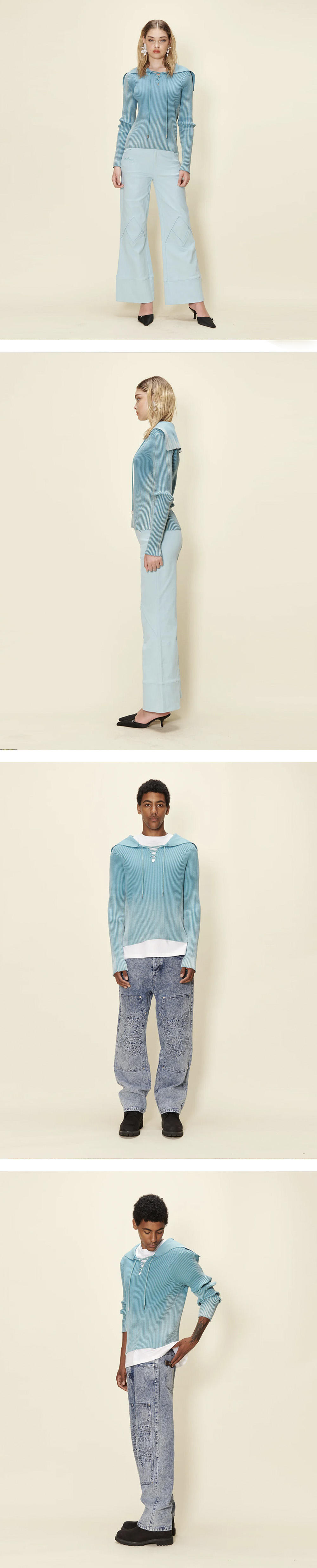 - 페이드 컬러 디테일이 돋보이는 립니트입니다. - 세일러 카라 디자인이 더해진 상품입니다. - 카라에 로고 자수를 더해주었습니다. - 레이스 네크라인을 더해 포인트를 주었습니다. - 100% 코튼