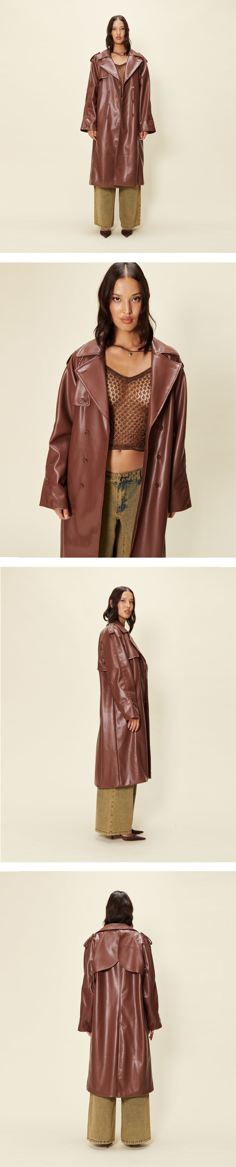 - 클래식한 롱 트렌치 코트에 레트로 카라 디자인을 더해준 상품입니다. - 비건 레더 상품입니다. - 절개 디테일을 더해준 상품입니다. - 여유있는 핏으로 편하게 착용 가능합니다. - 100% 폴리우레탄