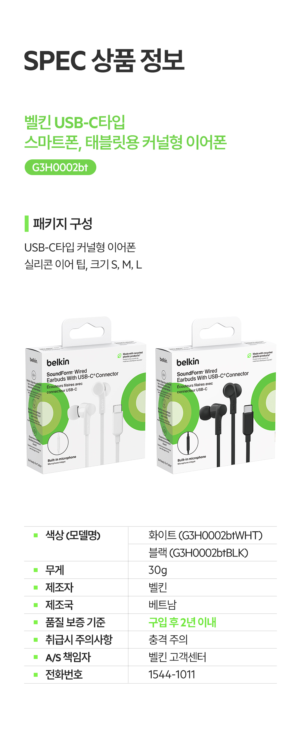 벨킨 C타입 유선 이어폰 G3H0002bt 화이트