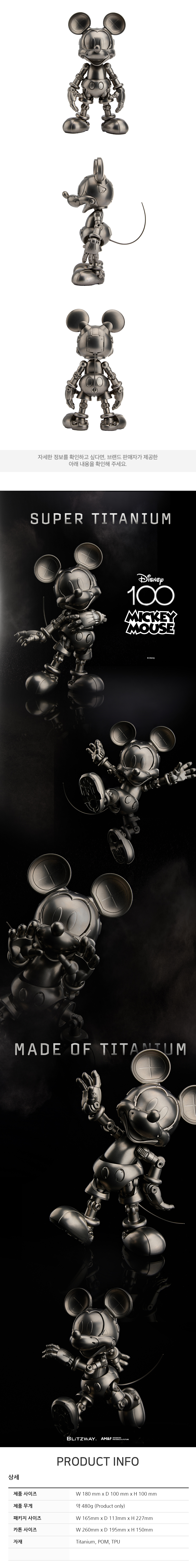 블리츠웨이 디즈니 100주년 ‘슈퍼 티타늄’ 미키 마우스 Blitzway의 새로운 레이블 ‘Super Titanium' D100 티타늄 미키마우스를 공개합니다. 가공이 용이하지 않은 티타늄 소재를 여러차례 섬세한 공정 과정에 거쳐 티타늄 미키마우스를 탄생시켰습니다. 표면의 뛰어난 디테일과 함께 견고한 라쳇 관절로 제작되어 미키마우스 특유의 다양한 포징이 가능합니다. 디즈니 100주년을 맞이하여 천년의 자원 ‘티타늄’으로 제작된 미키마우스와 함께 디즈니 밀레니엄의 시작을 알립니다!