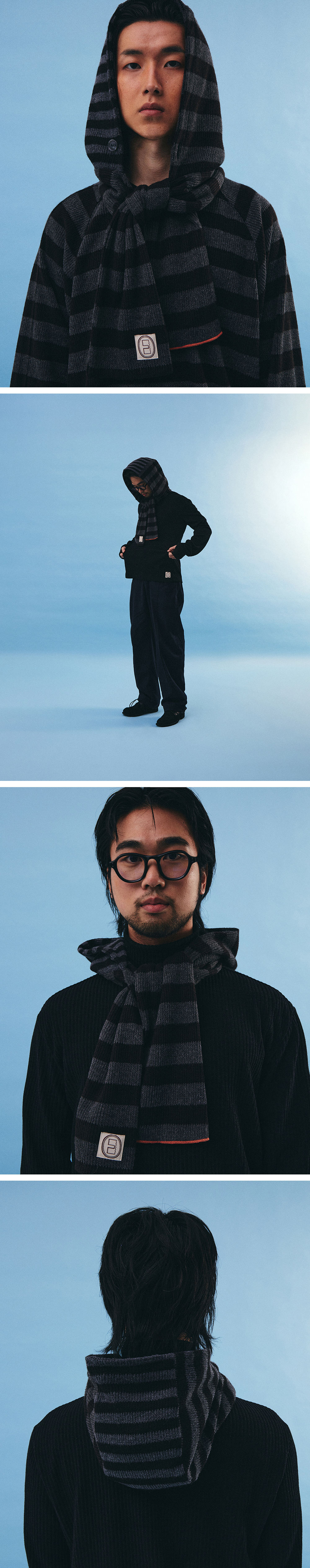 Product Info. - 언밸런스 스트라이프 니트로 제작 된 바라클라바 - 포근한 터치감과 도톰한 두께감으로 높은 보온성 - 머플러 형태로 제작되어 다양한 연출 가능 - 버튼 포인트로 사이즈 조절 가능 - 머플러 하단 시그니처 직조 라벨 포인트