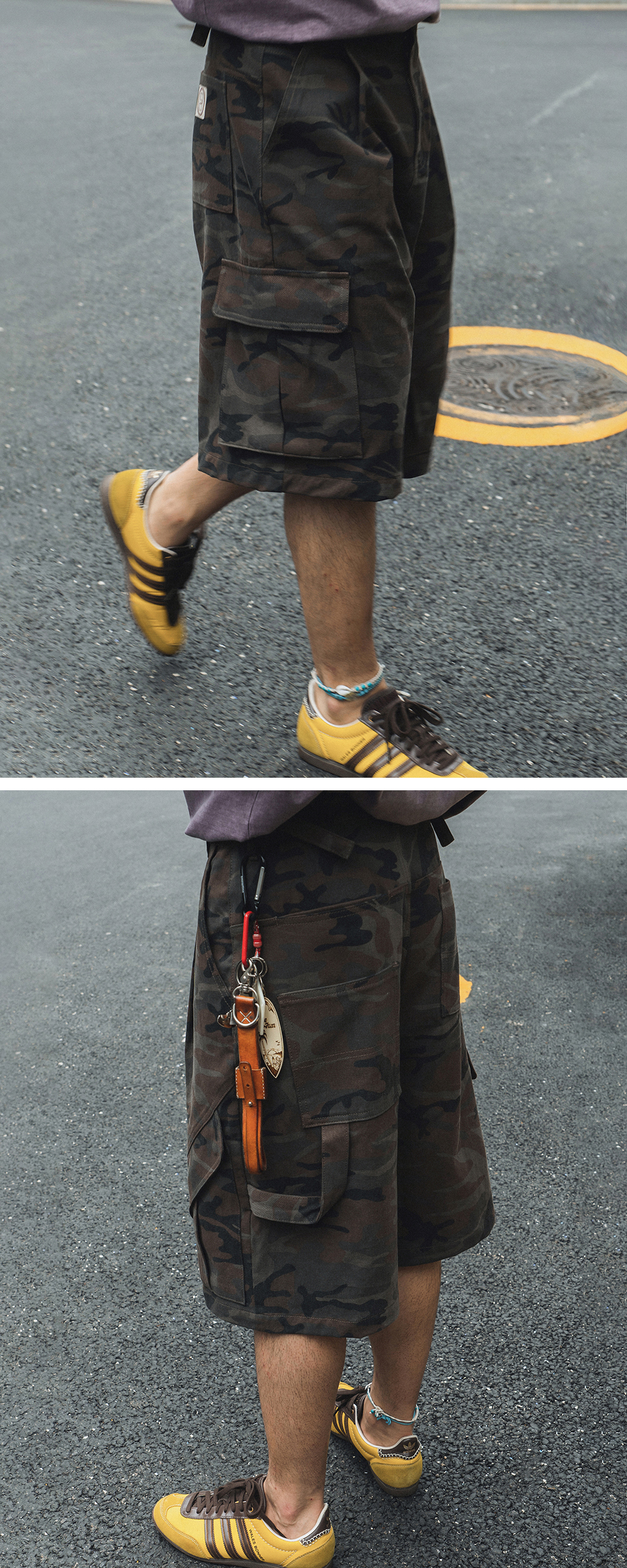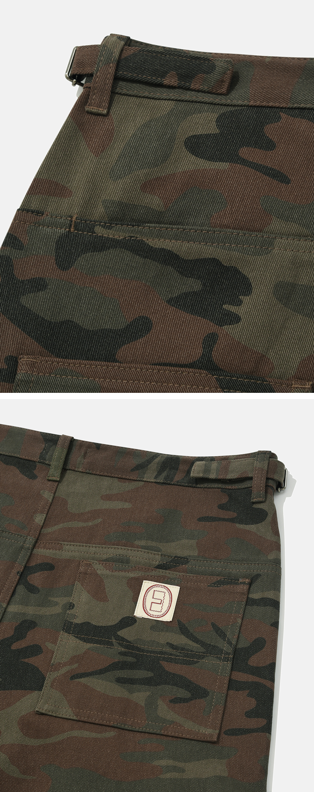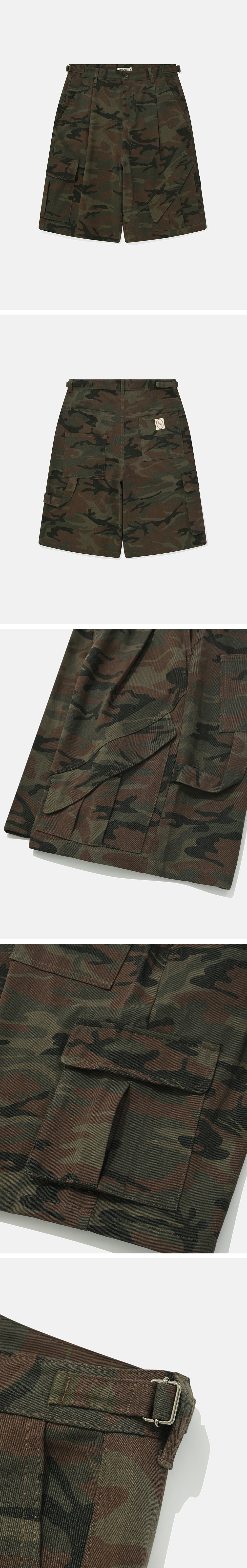 Product Info. - 빈티지 워싱 카모플라주 코튼으로 제작 된 버뮤다 팬츠 - 여유 있게 떨어지는 와이드 실루엣 - 전면 불균형한 구조의 입체 카고 포켓, 후면 2개의 비대칭 아웃 포켓과 절개 라인 웰트 포켓, 해머 루프 디테일 - 허리 사이즈 조절 가능한 양 사이드 어드저스터 디테일 - ykk 지퍼, ykk 택버튼 사용