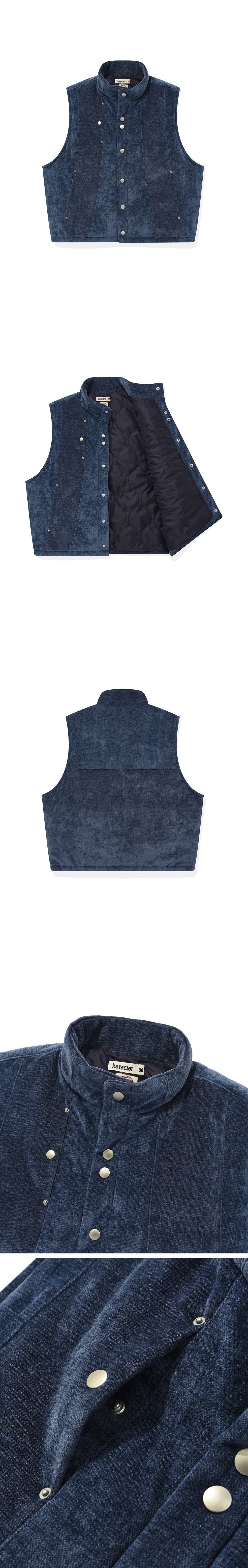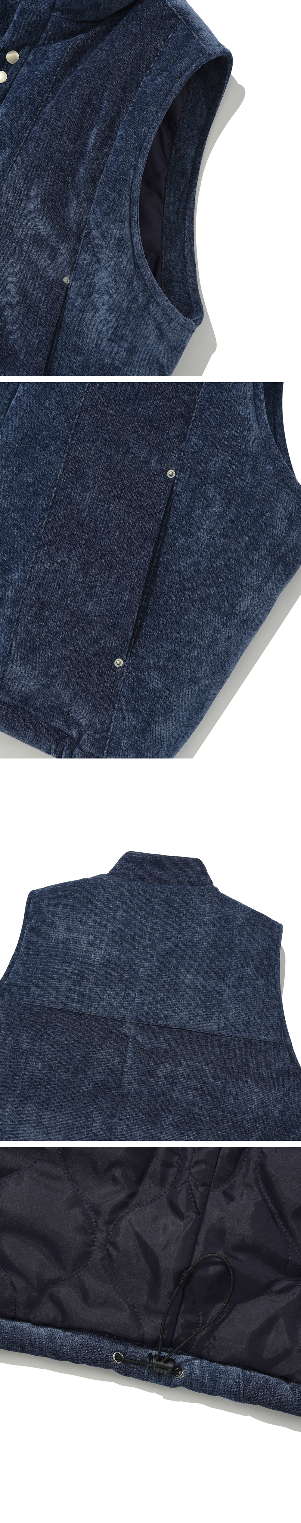 Product Info. - 벨벳과 유사한 조직의 고급스러운 소재로 제작된 퀼팅 베스트 - 오리털 충전재보다 약 1.5배의 보온성을 지닌 3M Thinsulate 충전재 사용 - 안감 2.9oz 퀼팅, 겉감 5.9oz 퀼팅 이중 구조로 강화한 보온력 - 빛에 반사될 때에 드러나는 은은한 컬러 블록 디자인 - 전면부 더블 YKK Button 포인트, 절개 포켓 연결부 YKK Rivet 포인트 - 사이드 어드저스터로 밑단 사이즈 조절 가능