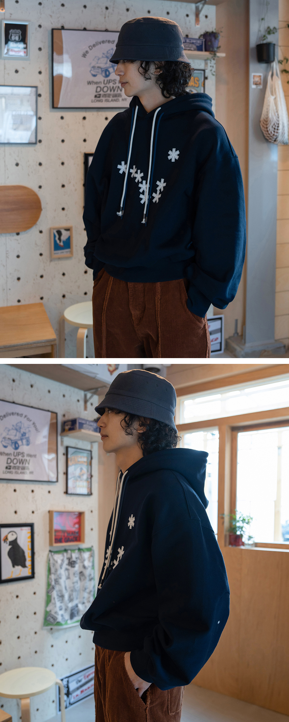 Product Info. - 750g 고중량 헤비쮸리 기모 원단으로 제작되어 도톰한 원단감과 높은 보온력 - 경쾌한 크롭 기장감과 여유 있는 실루엣 - 두 가지 컬러의 감각적인 더블 스트링 디자인 - 전면 스티치 프린팅 포인트와 양쪽 소매 팔꿈치 자수 포인트 - 전면 포켓 없는 디자인