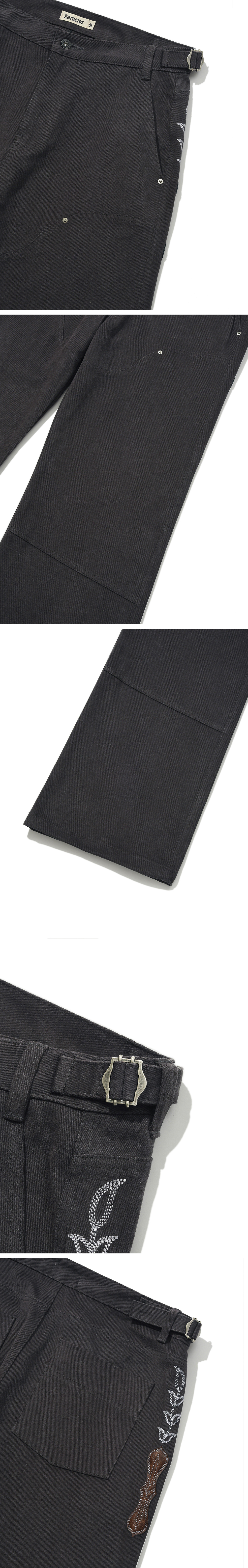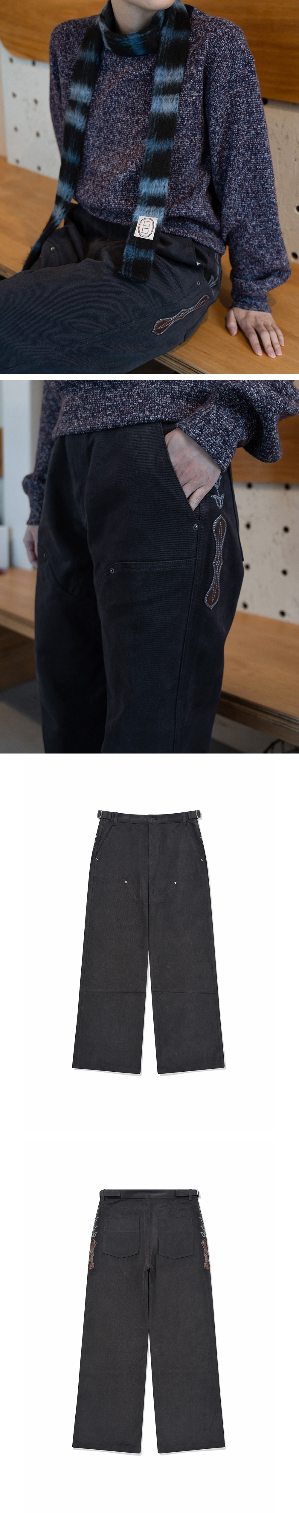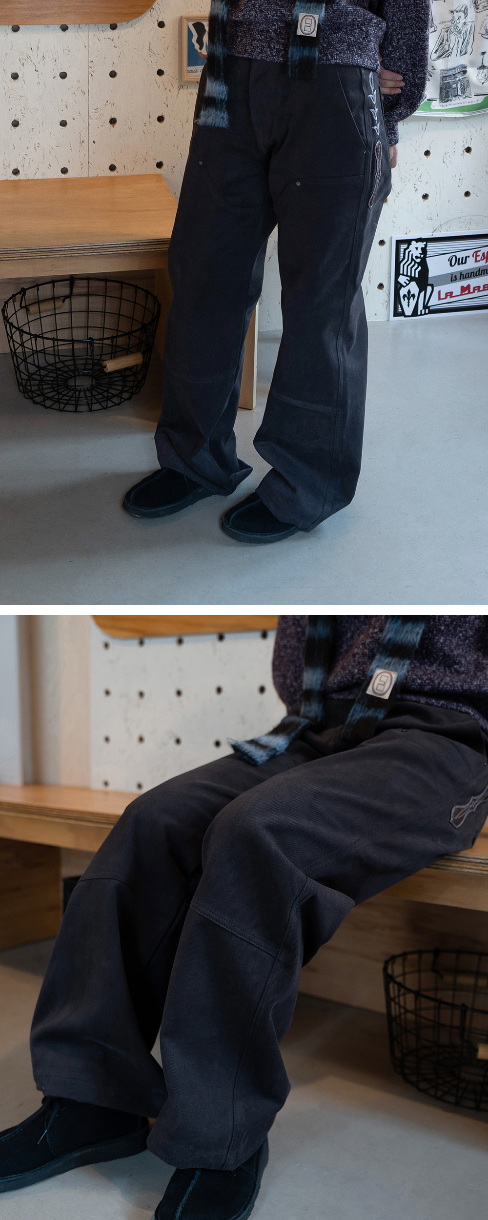 Product Info. - 피치 가공한 7수 고밀도 트윌 원단으로 제작된 워크 팬츠 - 웨스턴 무드의 가죽 패치 자수 포인트, ykk 캔톤/리벳 포인트 - 곡선형의 카펜터 절개 디테일 - 와이드 핏으로 떨어지는 세미 부츠 컷 실루엣 - 허리 사이즈 조절 가능한 양 사이드 어드저스터 디테일