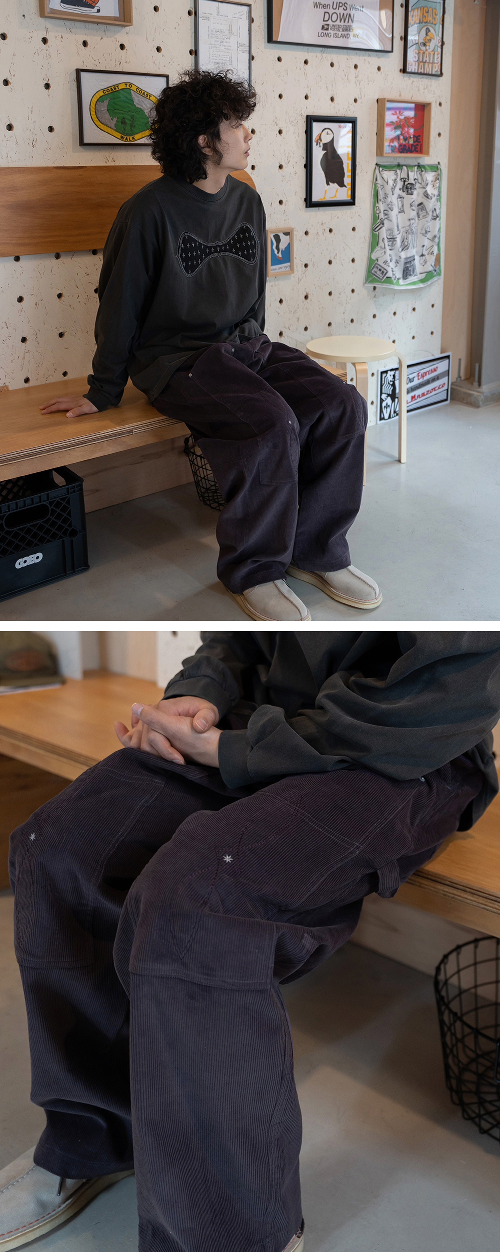Product Info. - 11W 조직의 코듀로이 원단으로 제작된 카펜터 팬츠 - 웨스턴 무드의 패치 자수 포인트와 포켓으로 활용 가능한 무릎 패치 디자인 - ykk 캔톤과 리벳, 오금 절개, 후면 해머 루프 디테일 - 여유 있게 떨어지는 와이드 핏 실루엣 - 허리 사이즈 조절 가능한 양 사이드 어드저스터 디테일