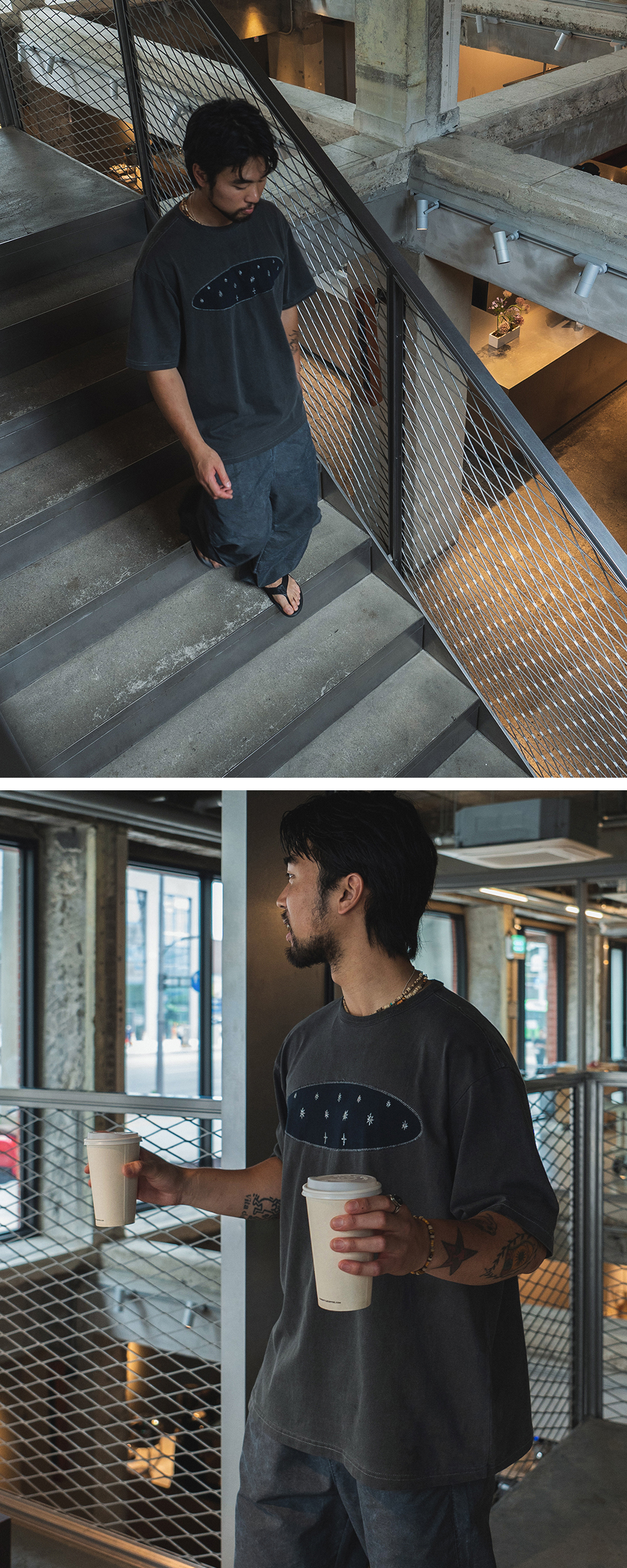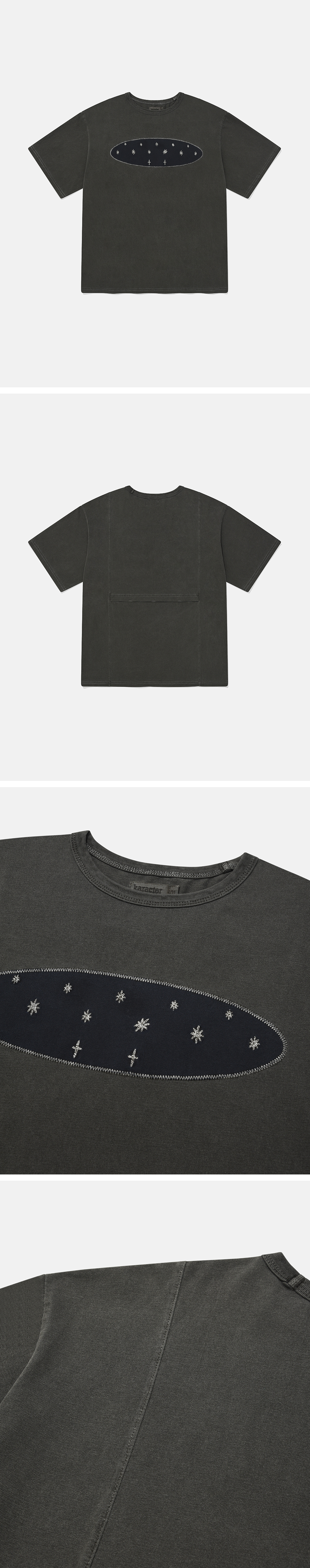 Product Info. - 밀도 높은 16수 싱글 원단 - 빈티지 무드의 가먼트 다잉을 거친 반팔 티셔츠 - 편안한 착용감 오버사이즈드 핏 - 전면 자수 패치워크 디자인 - 후면부 구조적 패널, 플랩 바텍 디테일