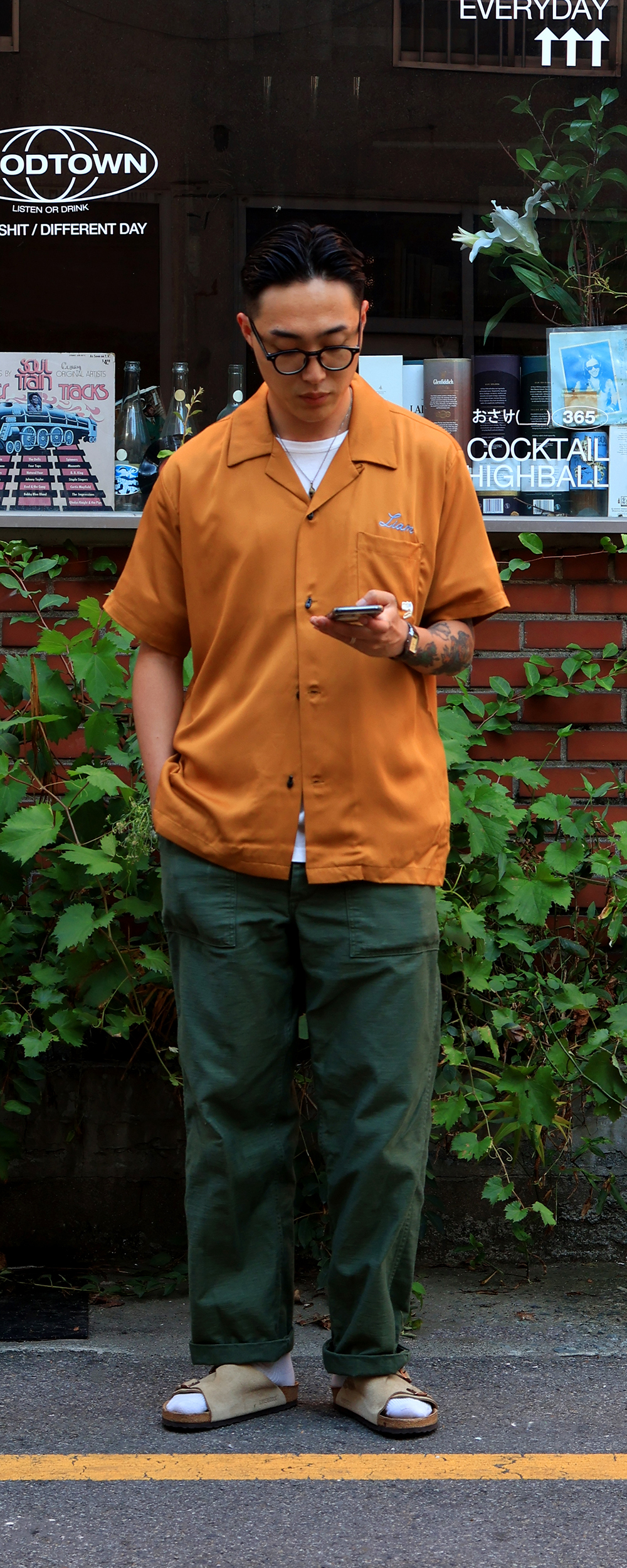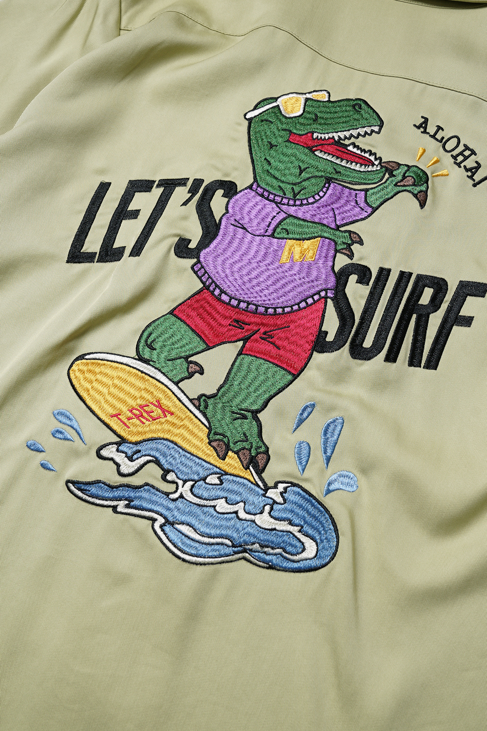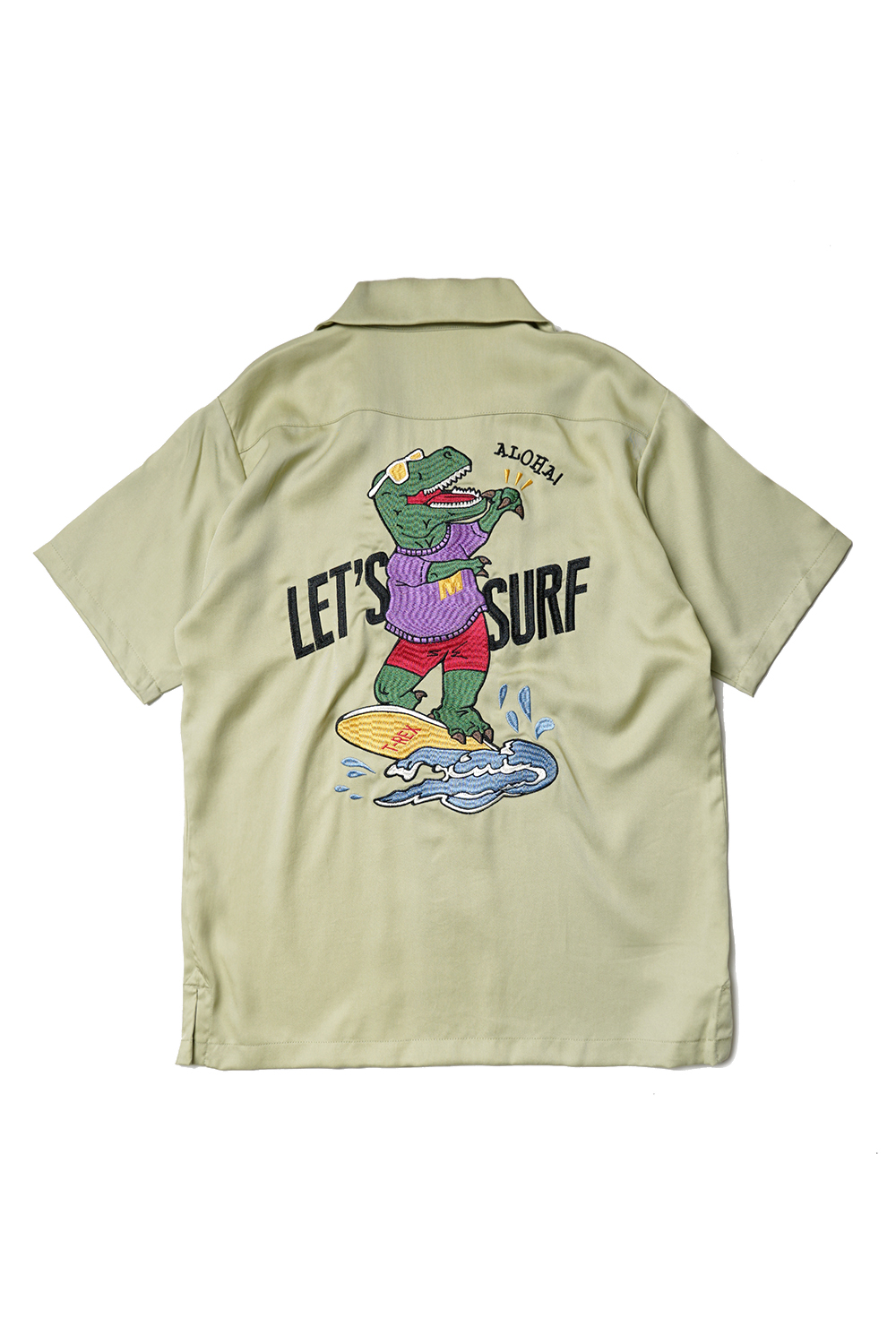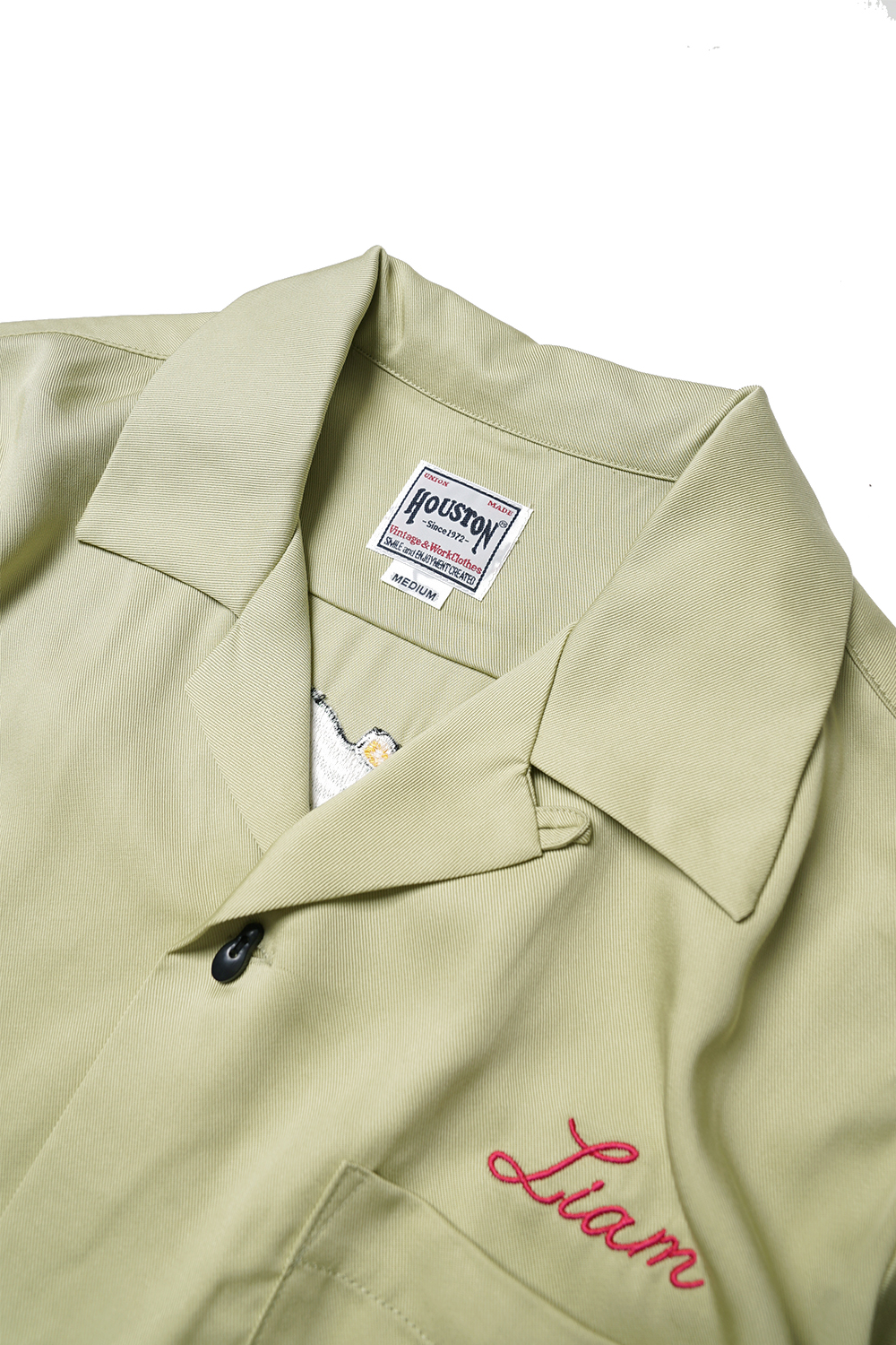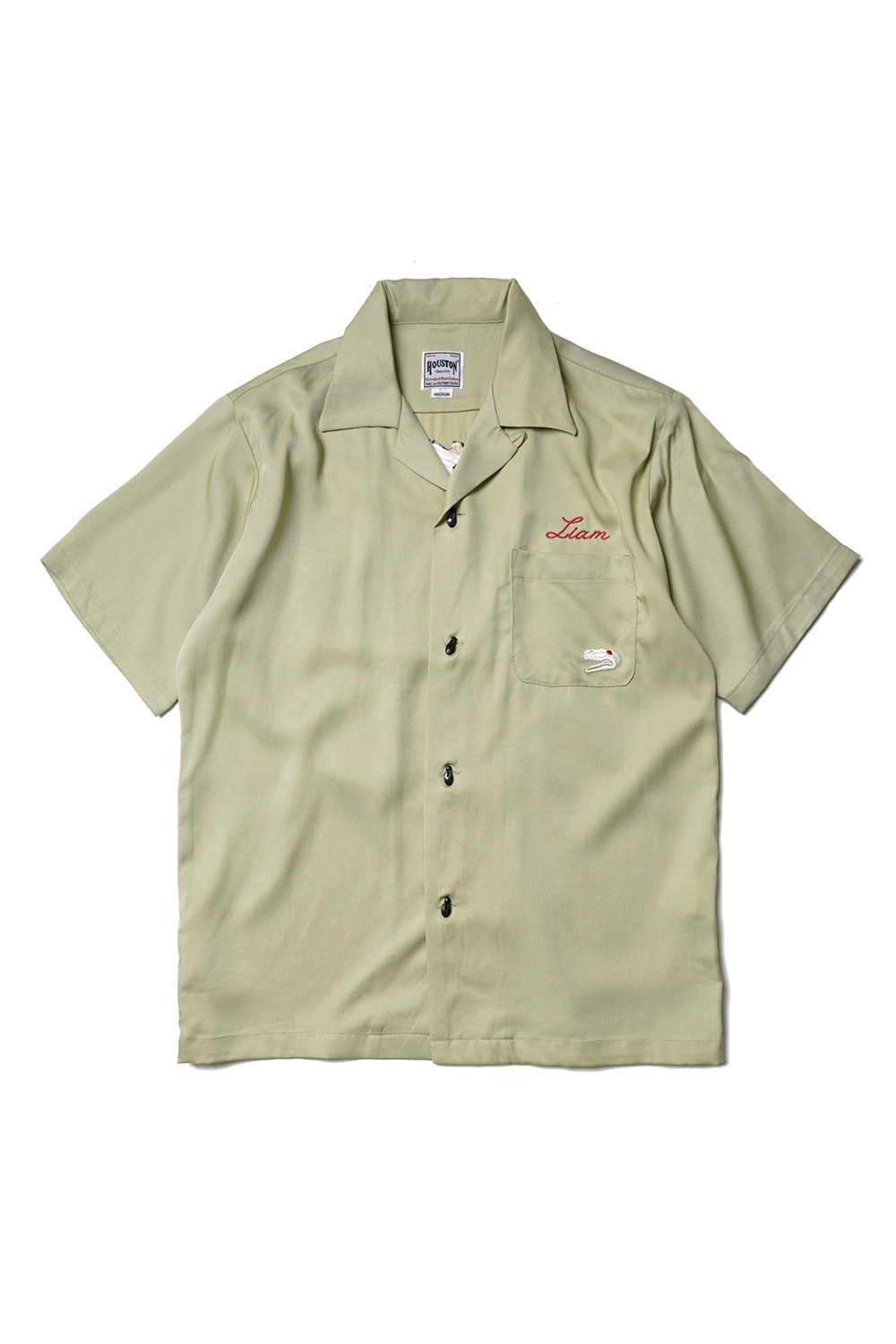 Houston Japan 41043 Bowling Shirt (Dinosaur) - Lime Green 휴스턴 재팬의 썸머 스테디 셀러 아이템 '볼링 셔츠'입니다. 친환경 재생 섬유인 'Tencel'을 사용하여, 부드러우면서도 은은한 광택이 특징입니다. 목 부분은 오픈카라 형태이며, 포켓에는 공룡 자수, 상단에는 네임자수가 놓여있습니다. 프론트에는 볼링핀 디자인의 유니크한 버튼을 채택하였습니다. 그리고 후면부에는 서핑보드를 탄 공룡이 디자인 되어있습니다.
