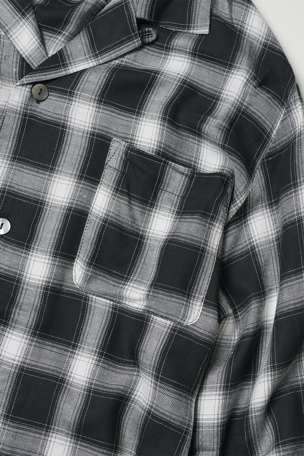 Houston Japan 41005 Rayon Ombre Check Shirt - Black 레이온 소재의 옴브레 셔츠입니다. 레이온 특유의 부드러우며 고급스러운 소재감과 그라데이션으로 떨어지는 매력적인 컬러가 특징입니다. 오픈 카라 형태로 목 부분의 조개 버튼을 사용하여 개폐가 가능합니다. 프론트 좌측에는 포켓이 배치되어 있으며, 밑단은 박스타입입니다.