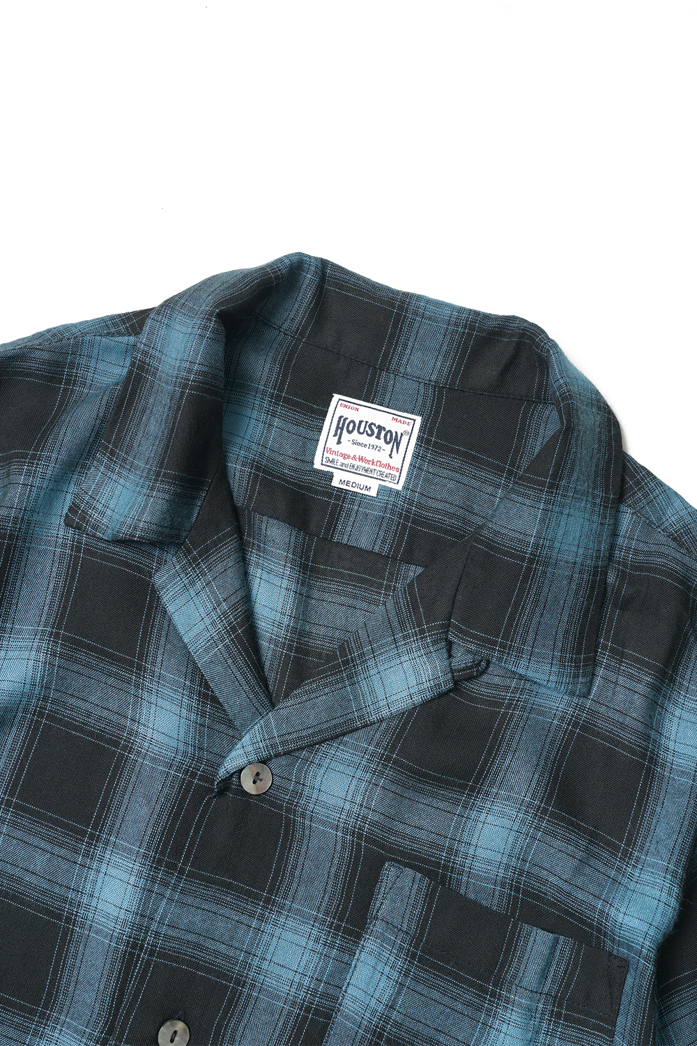 Houston Japan 41005 Rayon Ombre Check Shirt - Blue 레이온 소재의 옴브레 셔츠입니다. 레이온 특유의 부드러우며 고급스러운 소재감과 그라데이션으로 떨어지는 매력적인 컬러가 특징입니다. 오픈 카라 형태로 목 부분의 조개 버튼을 사용하여 개폐가 가능합니다. 프론트 좌측에는 포켓이 배치되어 있으며, 밑단은 박스타입입니다.
