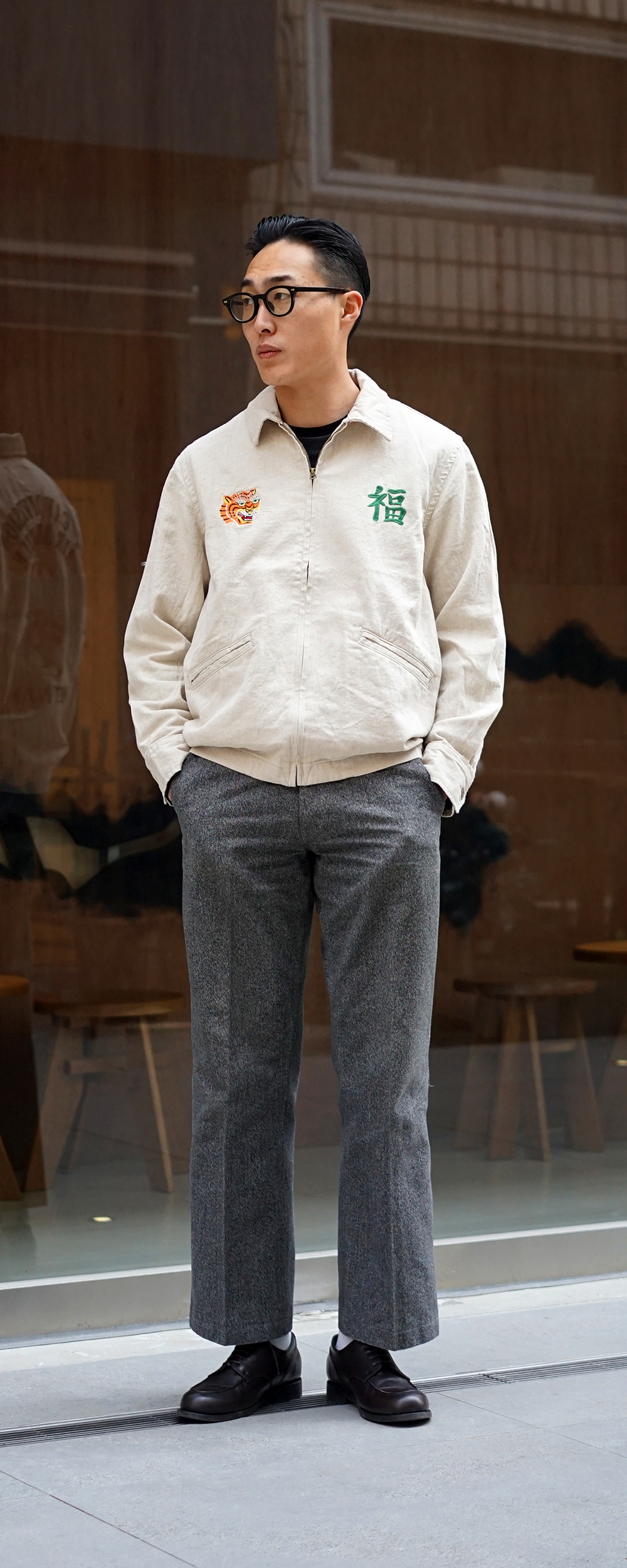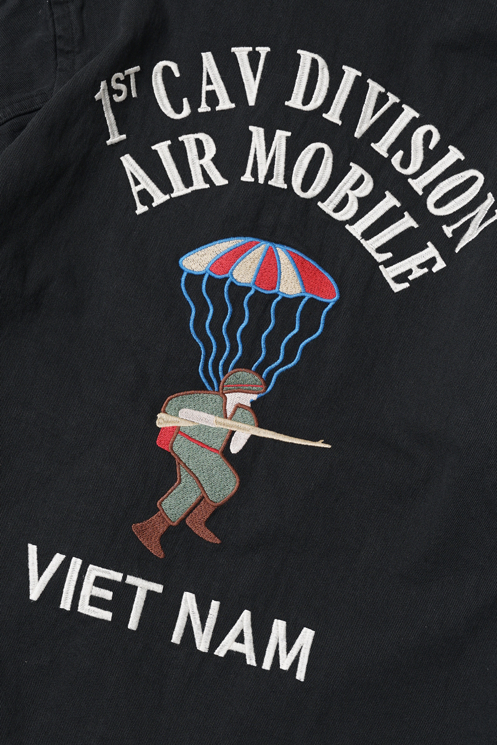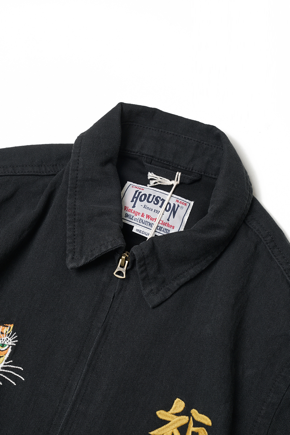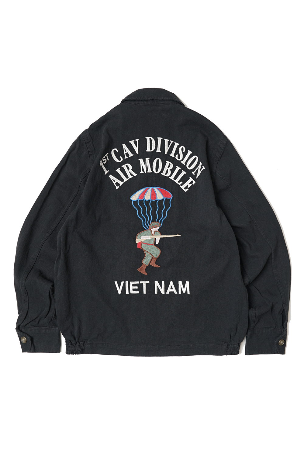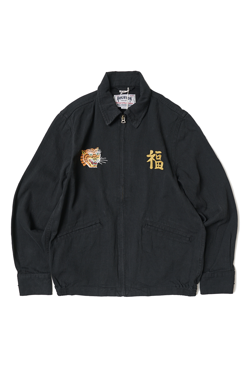 Houston Japan 51244 Parachute Cotton Linen Vietnam Jacket - Black 탄력감있고 통풍성이 뛰어난 면마 트윌을 사용한 베트남 자켓입니다. 프론트는 집업타입이며, 양쪽으로 호랑이와 한자 '福'의 자수가 배치되어 있습니다. 소매는 싱글 버튼 사양이며, 양 사이드에는 포켓이 있습니다. 밑단 부분에는 신축성있는 고무사양으로 제작하여 여유로운 실루엣이 특징입니다. 후면에는 낙하산이 디자인 되어있습니다.
