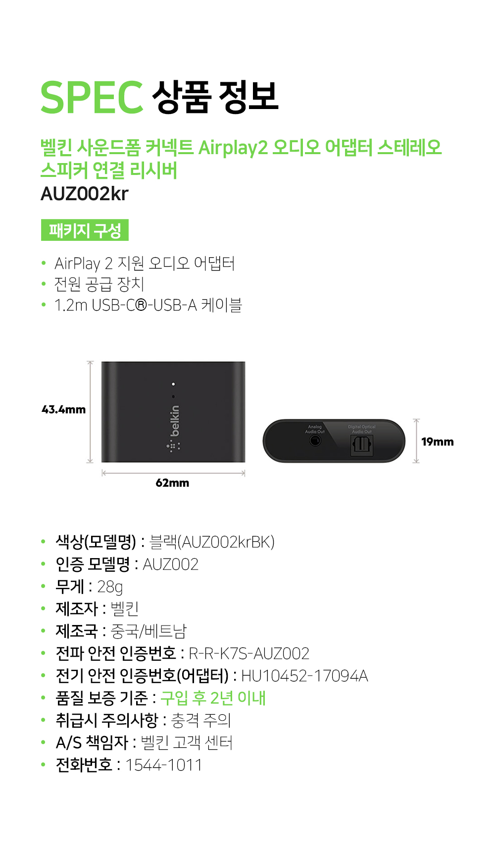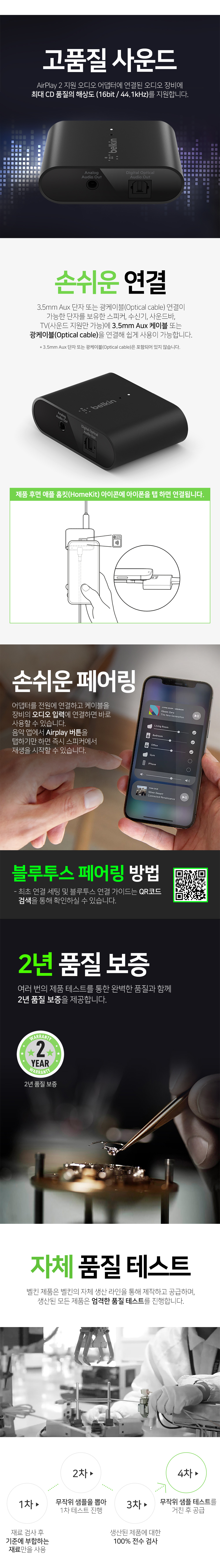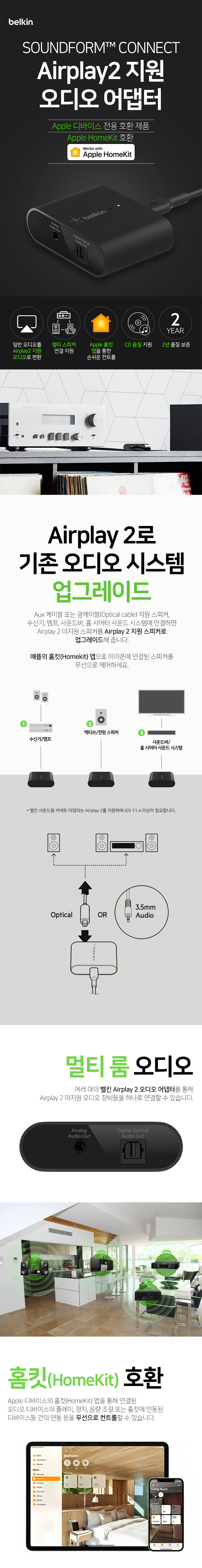 벨킨 사운드폼 커넥트 Airplay2 오디오 어댑터 스테레오 스피커 연결 리시버 AUZ002