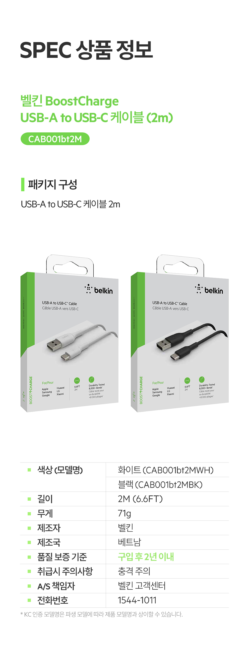 벨킨 부스트업 USB-A to C타입 충전 케이블 2M CAB001bt2M 화이트