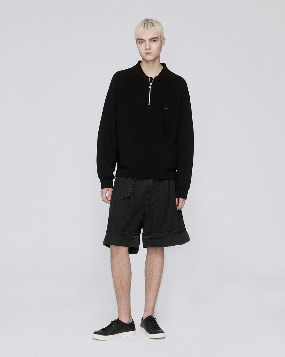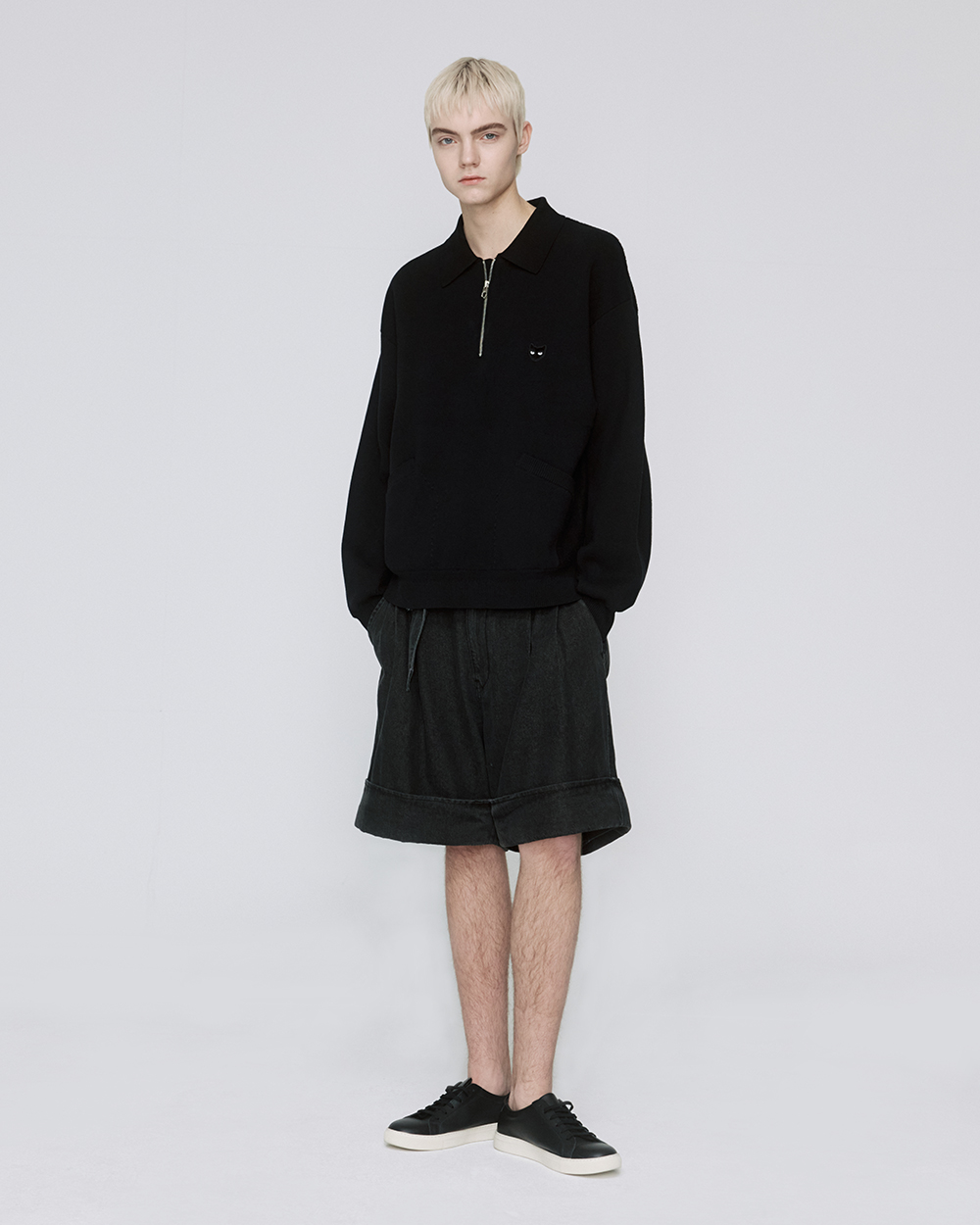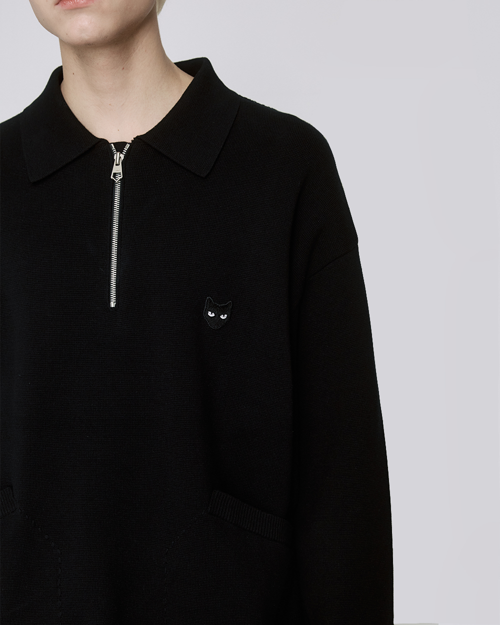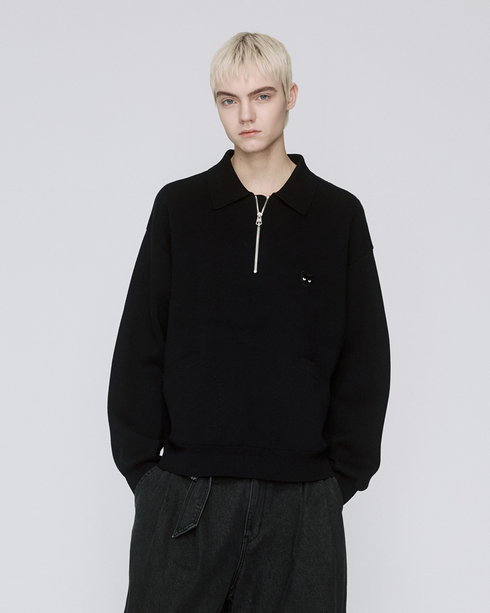 - 코튼 밀라노 조직 카라 반집업 니트 구성 - 옆선 슬릿 디테일을 활용한 자연스러운 실루엣 - 우수한 내구성과 흡수성의 코튼 원사 사용 - 측면과 후면 리버스 조직 포인트 - 후면 삼각 립과 지제로 로고 금속 장식 디테일 - 전면 포켓 니트 스티치 디테일 - 전면 가슴 '그레이 아이즈' 펜서 와펜