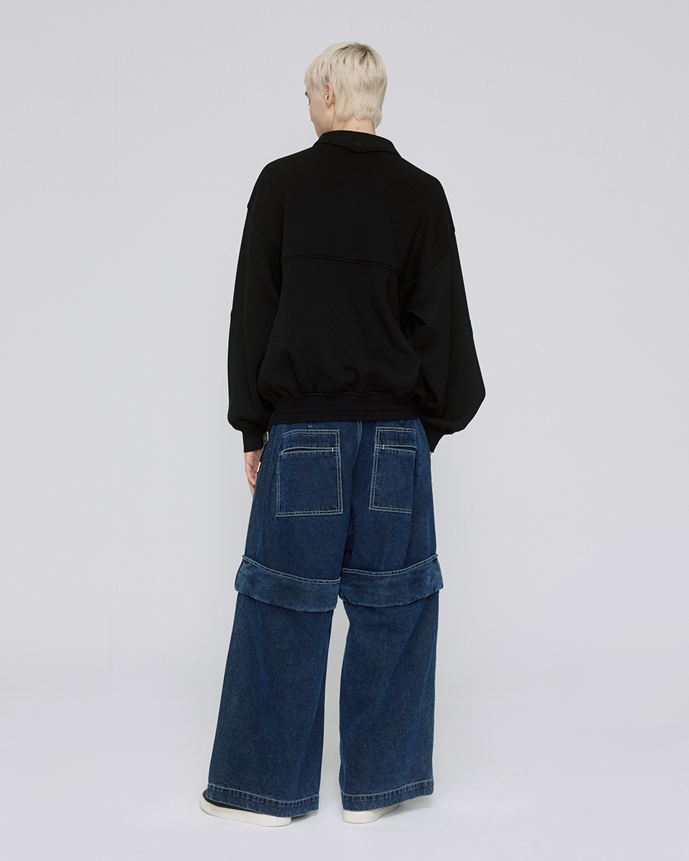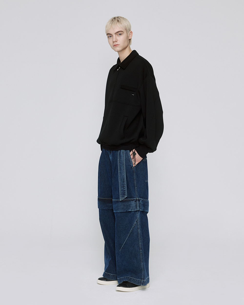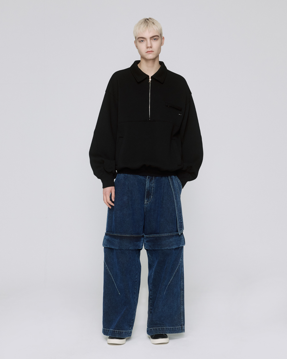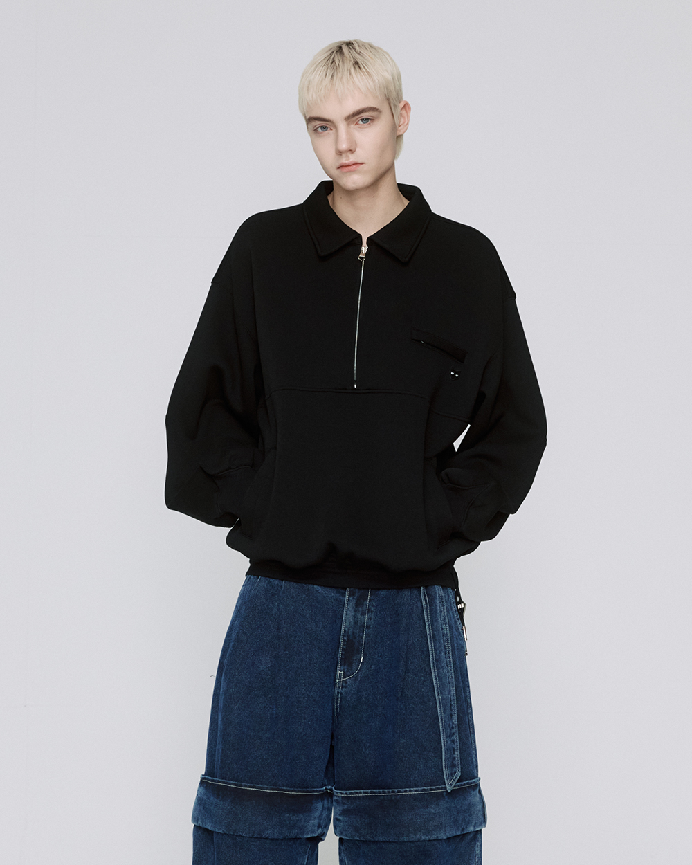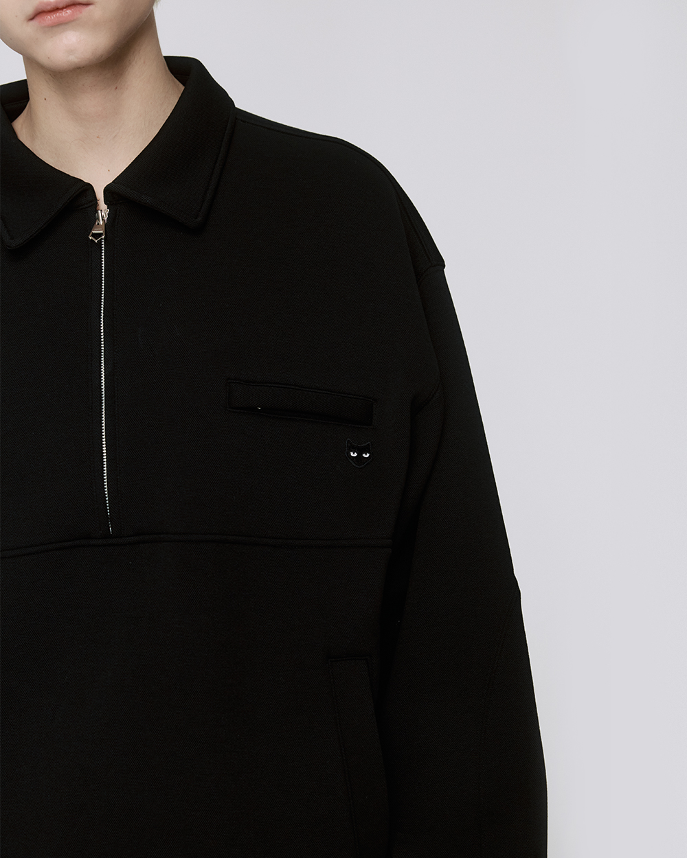 - 카라 아노락 티셔츠 - 하프 집업 형식의 지퍼 디테일 구성 - 아노락 형태의 절개 라인 구성 - 앞면 상단 히든 지퍼 디테일 포켓 구성 - 앞면 하단 사이드 포켓 구성 - 밑단의 사이즈 조절이 가능한 볼로타이 스트링 디테일 - 소매의 커브드 립 디테일 - 앞면 상단의 '그레이 아이즈' 미니 팬서 와펜 구성 - 카라 후면의 지제로 로고 구성