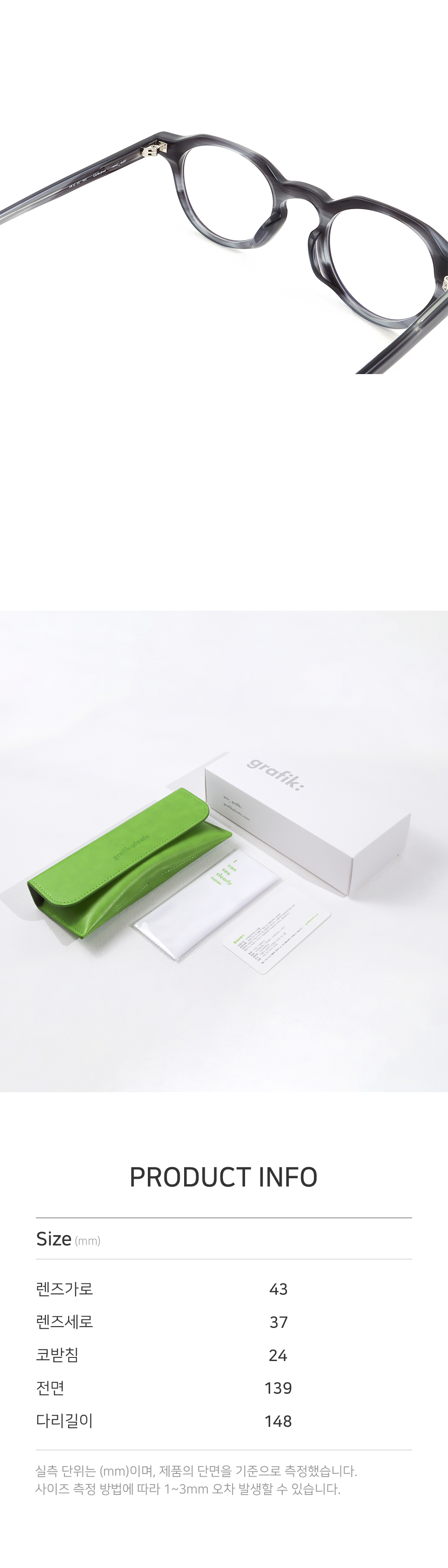*안경테에 장착되어있는 렌즈는 프레임의 형태의 변형을 막기 위한 플라스틱 데모렌즈입니다.