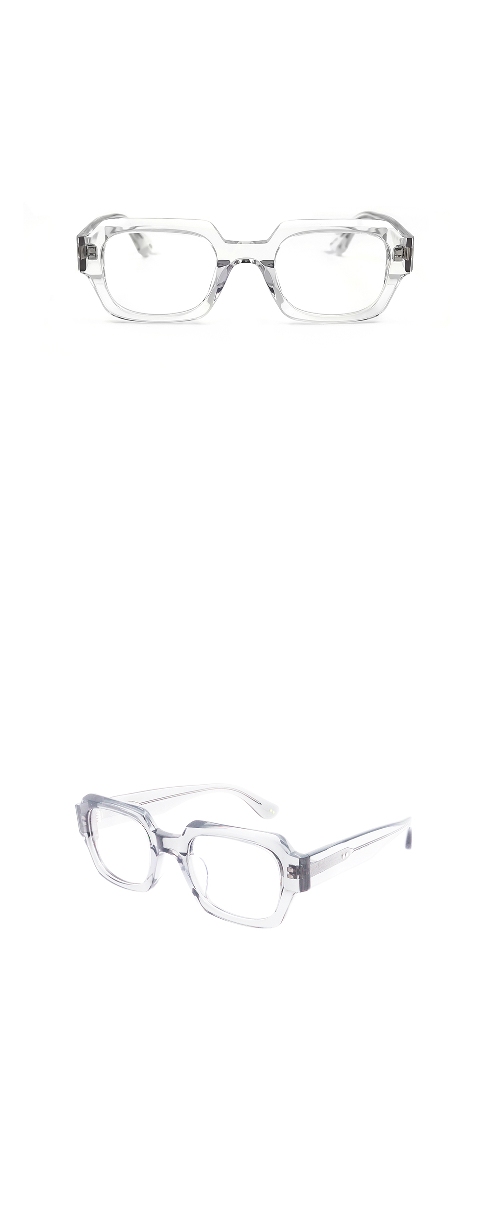 볼드한 스퀘어형태로, 프레임 상단부의 컷팅이 포인트 입니다. 두께감 있는 템플로 안정감있게 착용하실 수 있습니다.