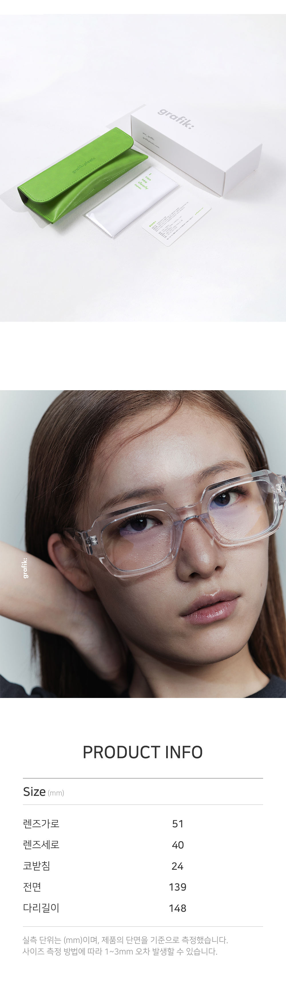 *안경테에 장착되어있는 렌즈는 프레임의 형태의 변형을 막기 위한 플라스틱 데모렌즈입니다.