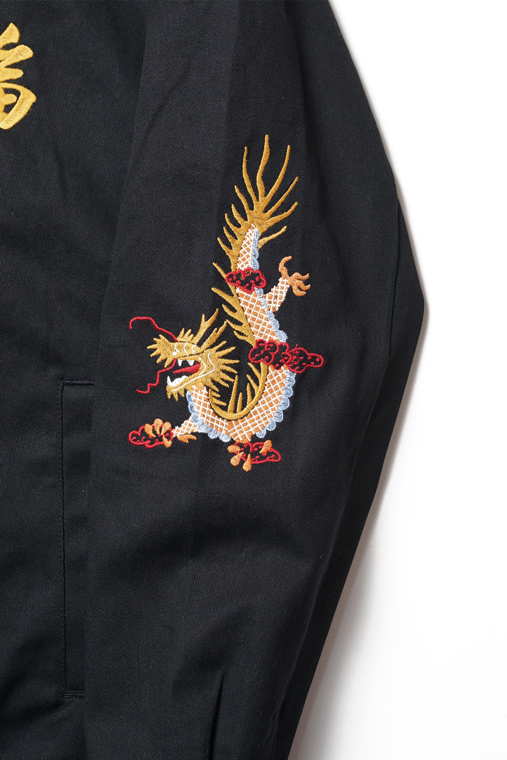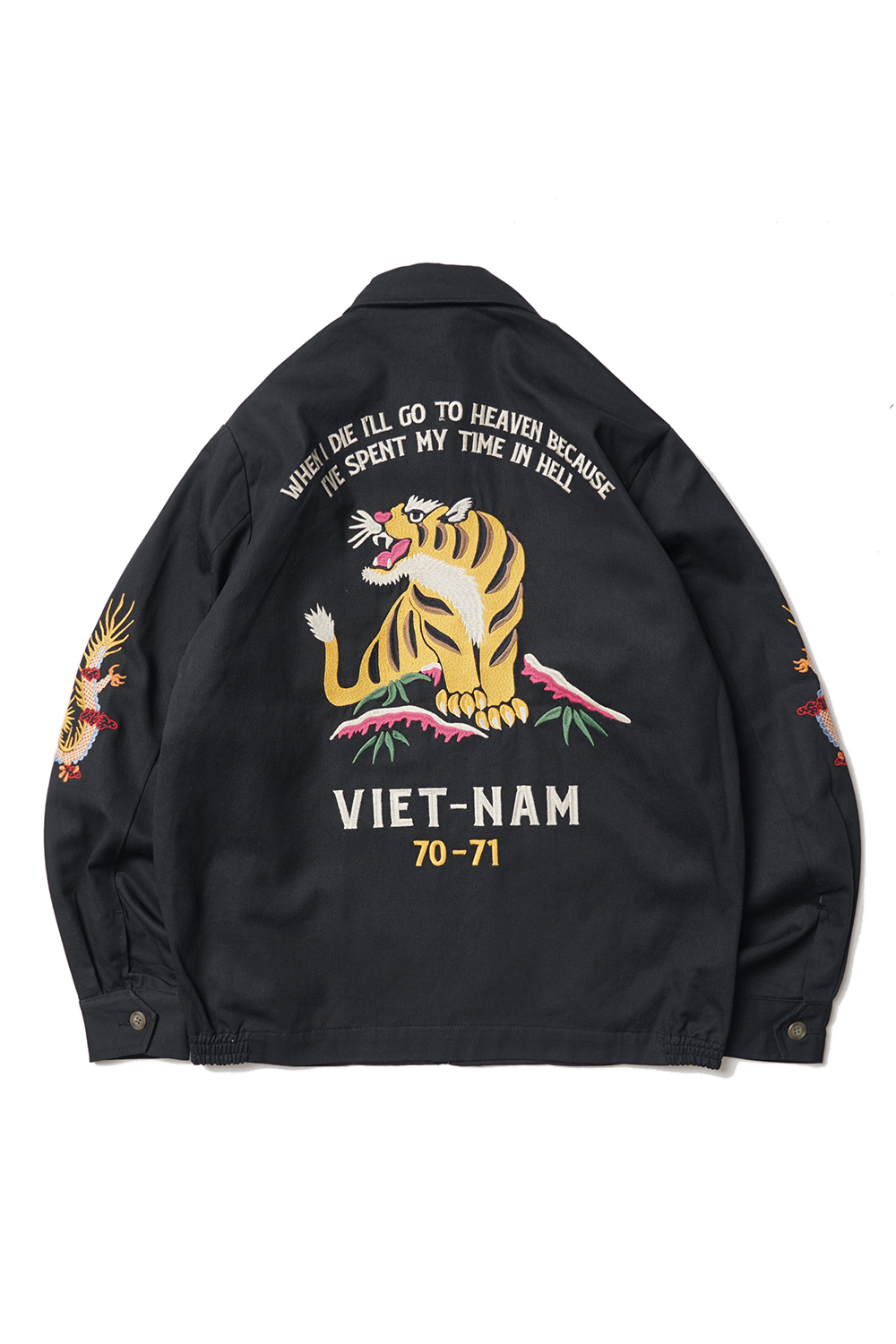 Houston Japan 51350 Cotton Vietnam Jacket (Tiger) - Black 화려한 컬러감의 코튼 능직을 사용하여 제작된 베트남 자켓입니다. 프론트는 집업 사양이며, 가슴의 양측으로 호랑이의 얼굴과 한자 복(福)이 자수되어 있습니다. 소매 역시 용의 자수가 디자인 되어 있으며, 싱글 버튼의 소맷단은 롤업에 용이합니다. 양측의 슬레쉬 포켓과 내부 좌측의 포켓이 있어 수납에 용이합니다. 후면부의 중앙에는 큰 형태의 호랑이 자수가 되어 있습니다.